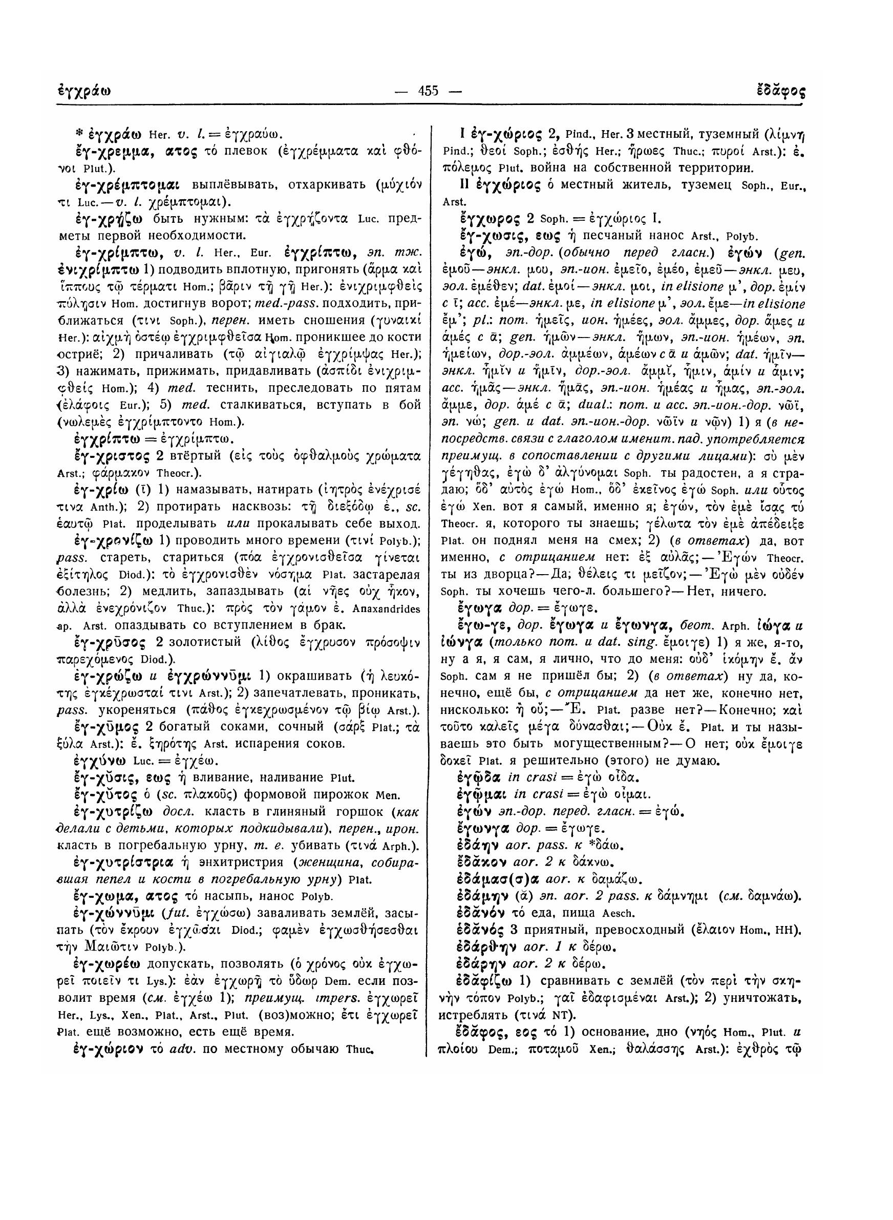 Книга была выпущена государственным издательством иностранных и национальных словарей в 1958 г. и больше не переиздавалась.Это самый полный древнегреческо-русский словарь, он содержит 70 тысяч статей со множеством цитат из древних авторов. до н.э. по II в. н.э.В словарь вошли греческие слова и выражения, встречающиеся в сочинениях римских писателей.Имена собственные (ономастика и топонимика) даны с краткими пояснениями и включены в общую алфавитную систему. Географические названия даны с наибольшей полнотой; из имен исторических и мифологических исключены лишь второстепенные.Почти все значения слов иллюстрированы лексическими и фразеологическими примерами.