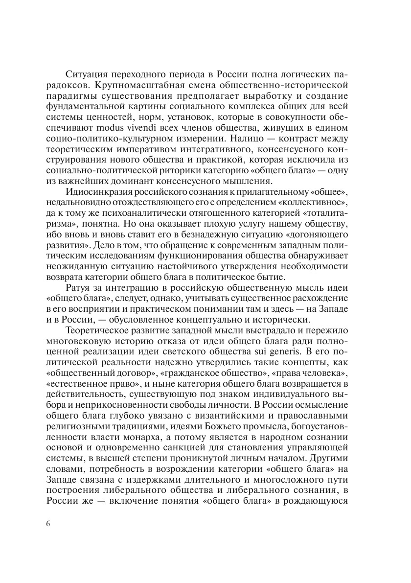 Коллективная монография посвящена анализу одной из самых актуальных проблем — духовному кризису современного мира, в первую очередь, российского общества, а также поиску путей и средств его преодоления в условиях растущей глобализации. В центре внимания авторского коллектива находится категория общего блага, в отдельных главах монографии доказывается необходимость ее возвращения в современную теорию общества и особенно в практику реформирования российского общества. Рассмотрены различные аспекты проблемы общенациональной идеологии для преодоления кризиса и духовного возрождения России.