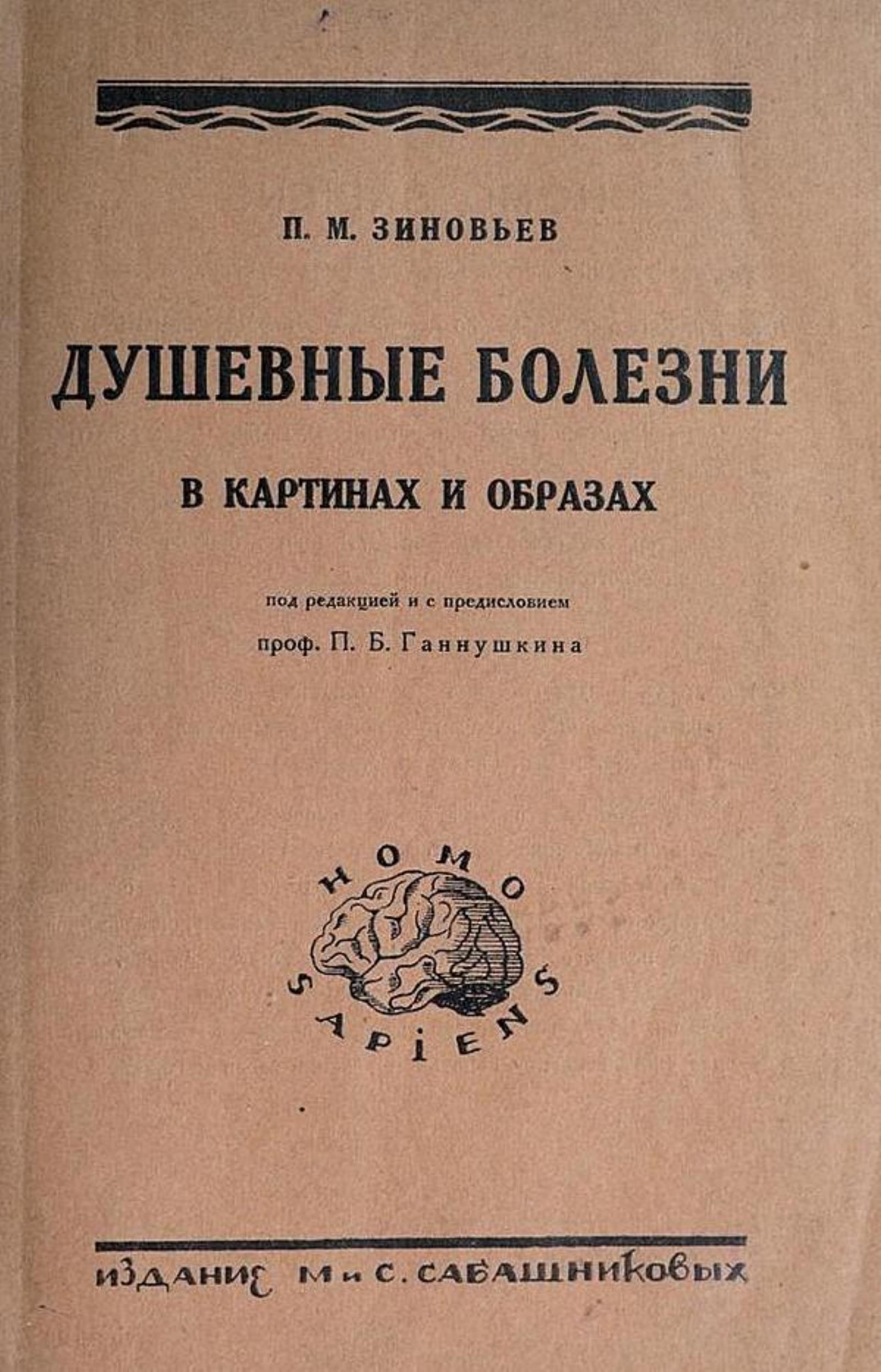 Зиновьев, Петр Михайлович. Душевные болезни в картинах и образах [Текст] : Психозы, их сущность и формы проявления / П. М. Зиновьев ; Под ред. и с предисл. проф. П. Б. Ганнушкина. — [Москва] : М. и С. Сабашниковы, 1927 (Л. : гос. Академич. тип.). — [3], 192 с.; 24?16 см.