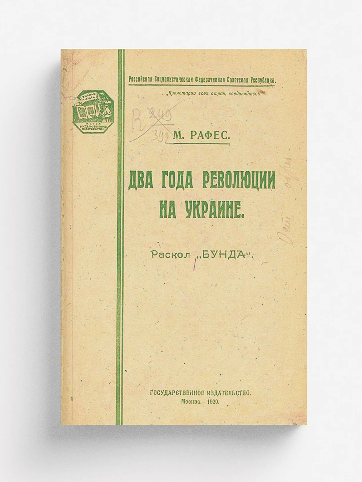 Рафес, Моисей Григорьевич. Два года революции на Украине (Эволюция и раскол «Бунда») / М. Г. Рафес. — Москва : Гос. изд-во, 1920. — 168 с.; 20 см.