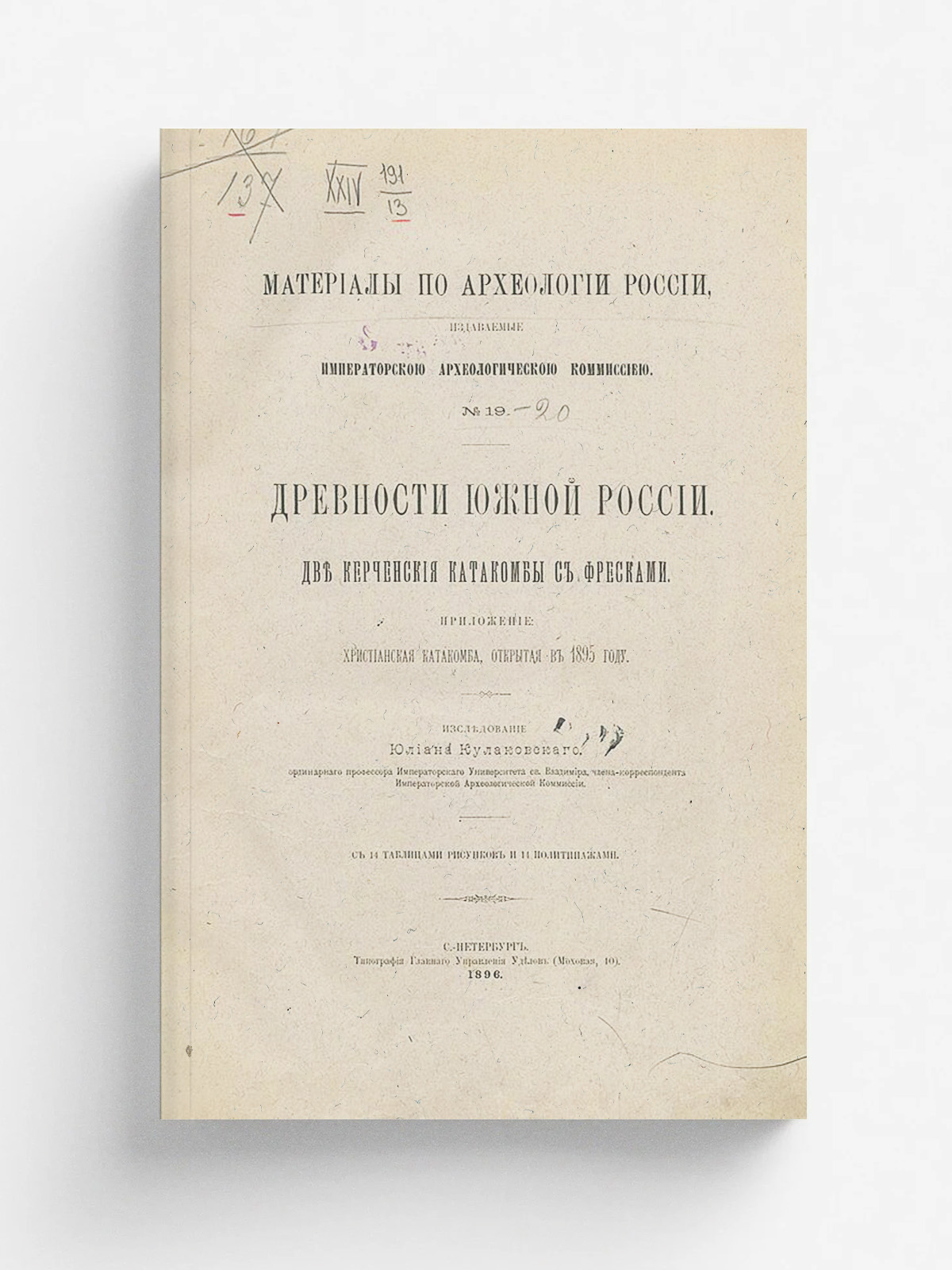 Кулаковский, Юлиан Андреевич (1855–1919). Две керченские катакомбы с фресками: Прил.: Христианская катакомба, открытая в 1895 г. : Исслед. Юлиана Кулаковского, орд. проф. Имп. Ун-та св. Владимира, чл.-кор. имп. Археол. комис. — Санкт-Петербург: тип. Гл. упр. уделов, 1896. — [2], II, 67, [5] с., 15 л. цв. ил. : ил.; 35. — (Материалы по археологии России, изд. Императорской Археологической комиссией. Древности Южной России; № 19).