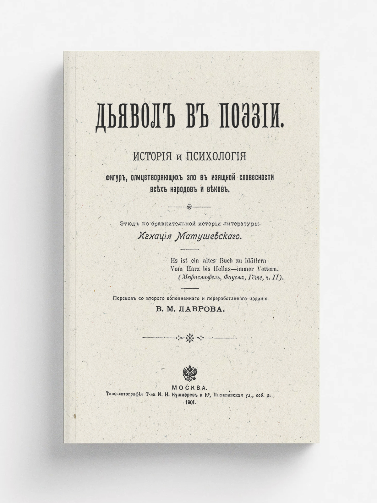 Матушевский, Игнаций (1858–1919). Дьявол в поэзии : История и психология фигур, олицетворяющих зло в изящной словесности всех народов и веков : Этюд по сравнит. истории литературы Игнация Матушевского / Пер. со 2 доп. и перераб. изд. М. В. Лаврова. — Москва : типо-лит. т-ва И. Н. Кушнерев и К°, 1901. — 283 с.; 19.