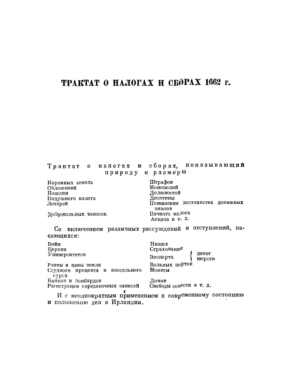 Петти анализирует важнейшие категории политической экономии. Книга включает одновременно ряд интереснейших статистических работ, анализирующих экономическое положение Ирландии, движение населения и т. д.