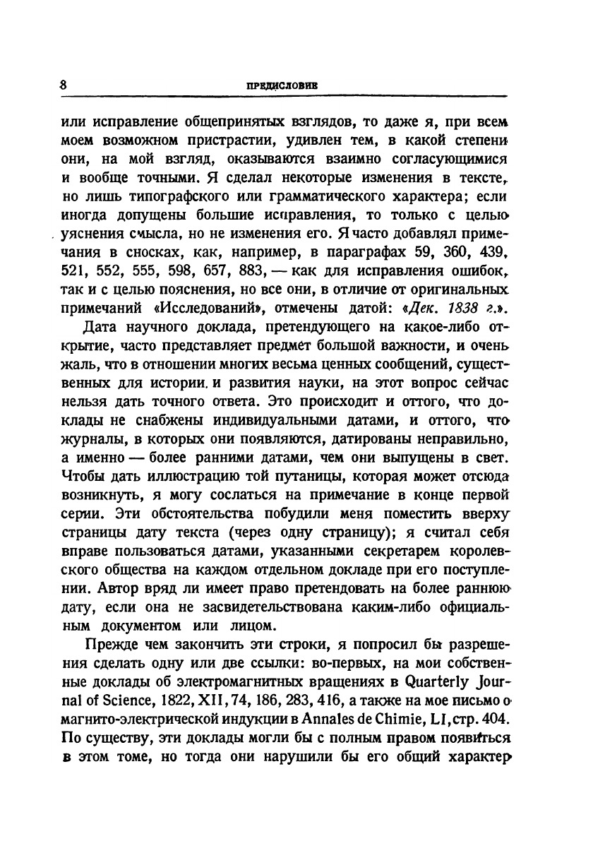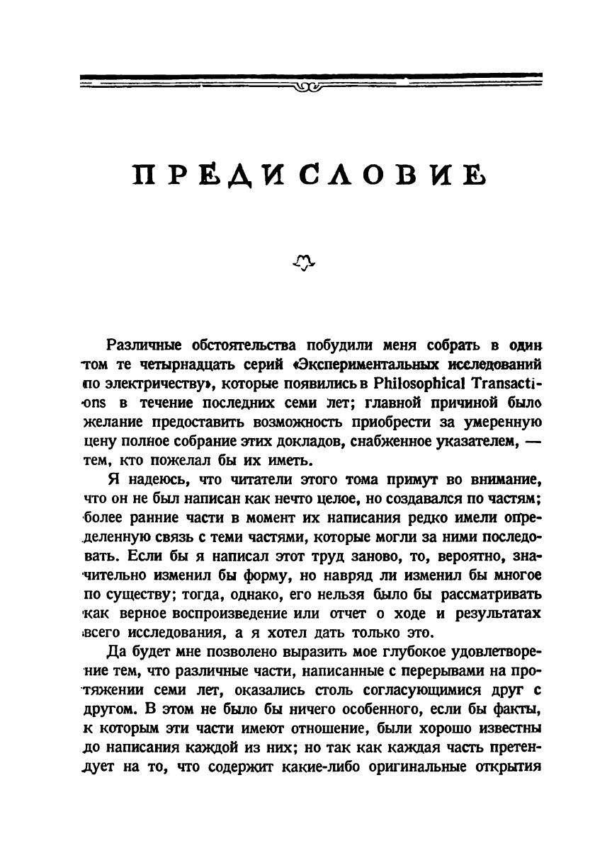 Различные обстоятельства побудили меня собрать в один том те четырнадцать серий «Экспериментальных исследований по электричеству», которые появились в Philosophical Transactions в течение последних семи лет; главной причиной было желание предоставить возможность приобрести за умеренную цену полное собрание этих докладов, снабженное указателем, — тем, кто пожелал бы их иметь. Я надеюсь, что читатели этого тома примут во внимание, что он не был написан как нечто целое, но создавался по частям; более ранние части в момент их написания редко имели определенную связь с теми частями, которые могли за ними последовать. Если бы я написал этот труд заново, то, вероятно, значительно изменил бы форму, но навряд ли изменил бы многое по существу; тогда, однако, его нельзя было бы рассматривать как верное воспроизведение или отчет о ходе и результатах «сего исследования, а я хотел дать только это. Королевский институт. М. Фарадей. Март 1839 г.По соображениям, указанным в предыдущем томе «Экспериментальных исследований по электричеству», я пришел к решению собрать оставшиеся серии и прибавить к ним кое-какие другие статьи, посвященные исследованиям по электричеству. М. Фарадей.