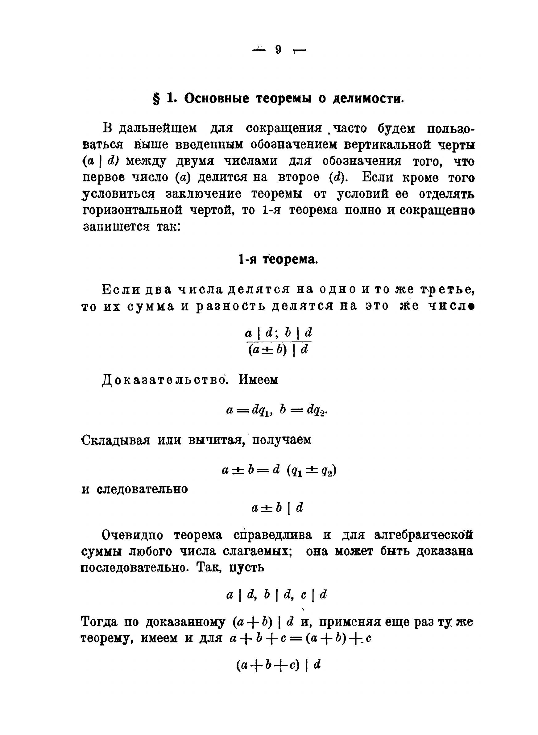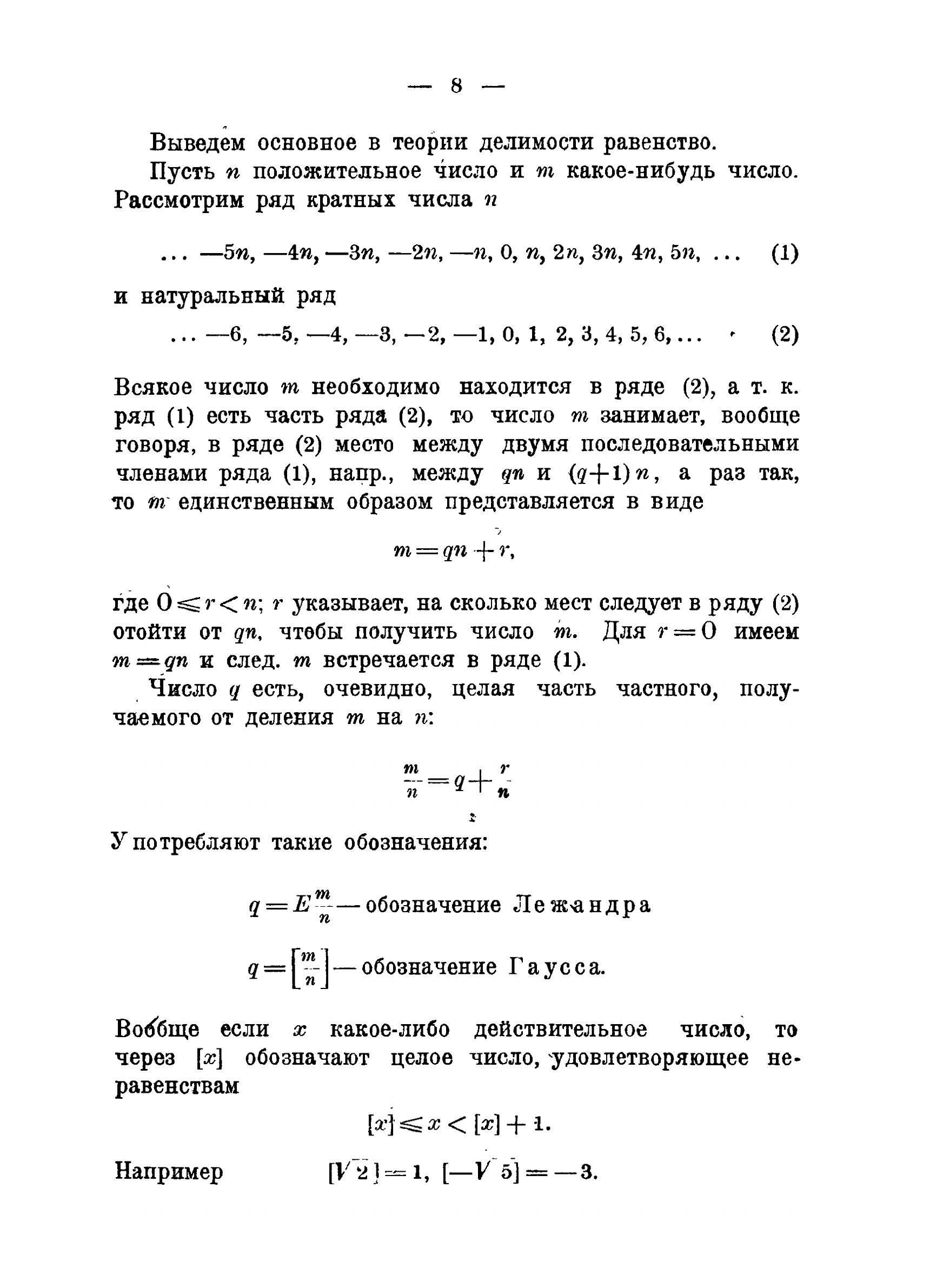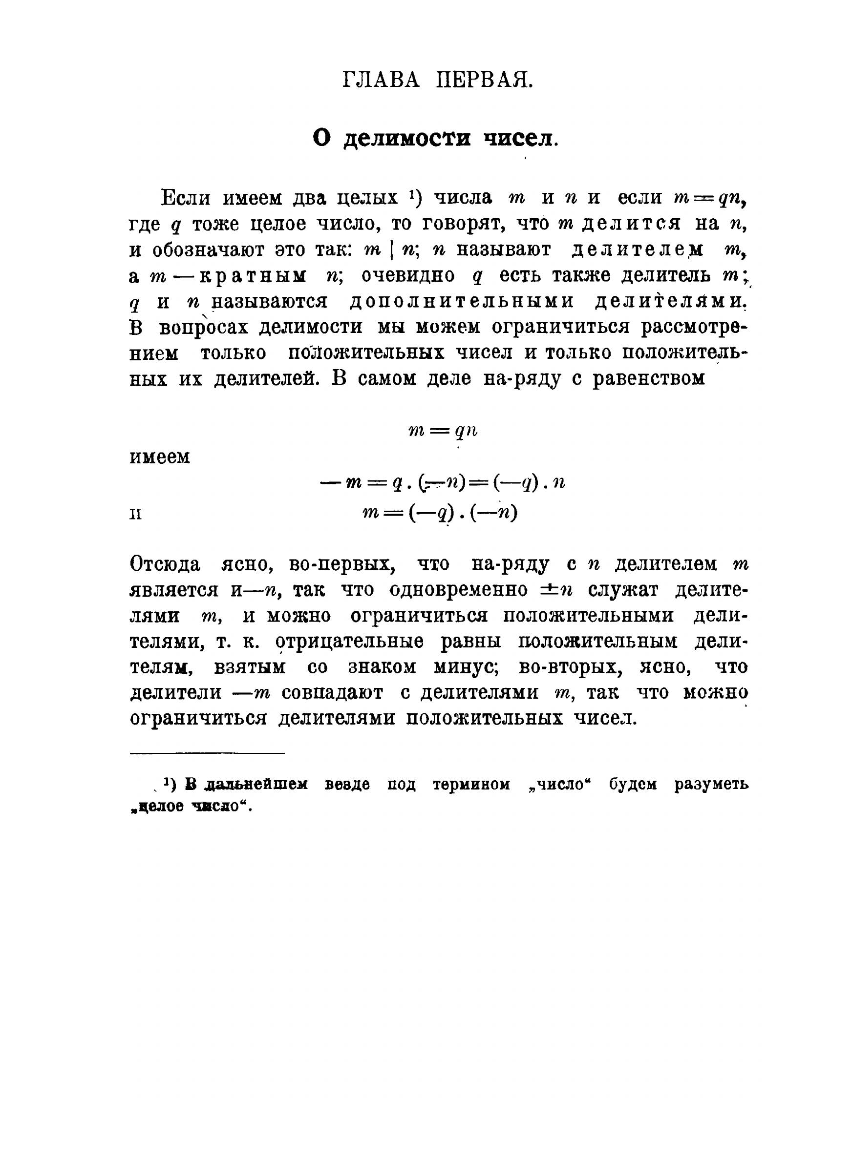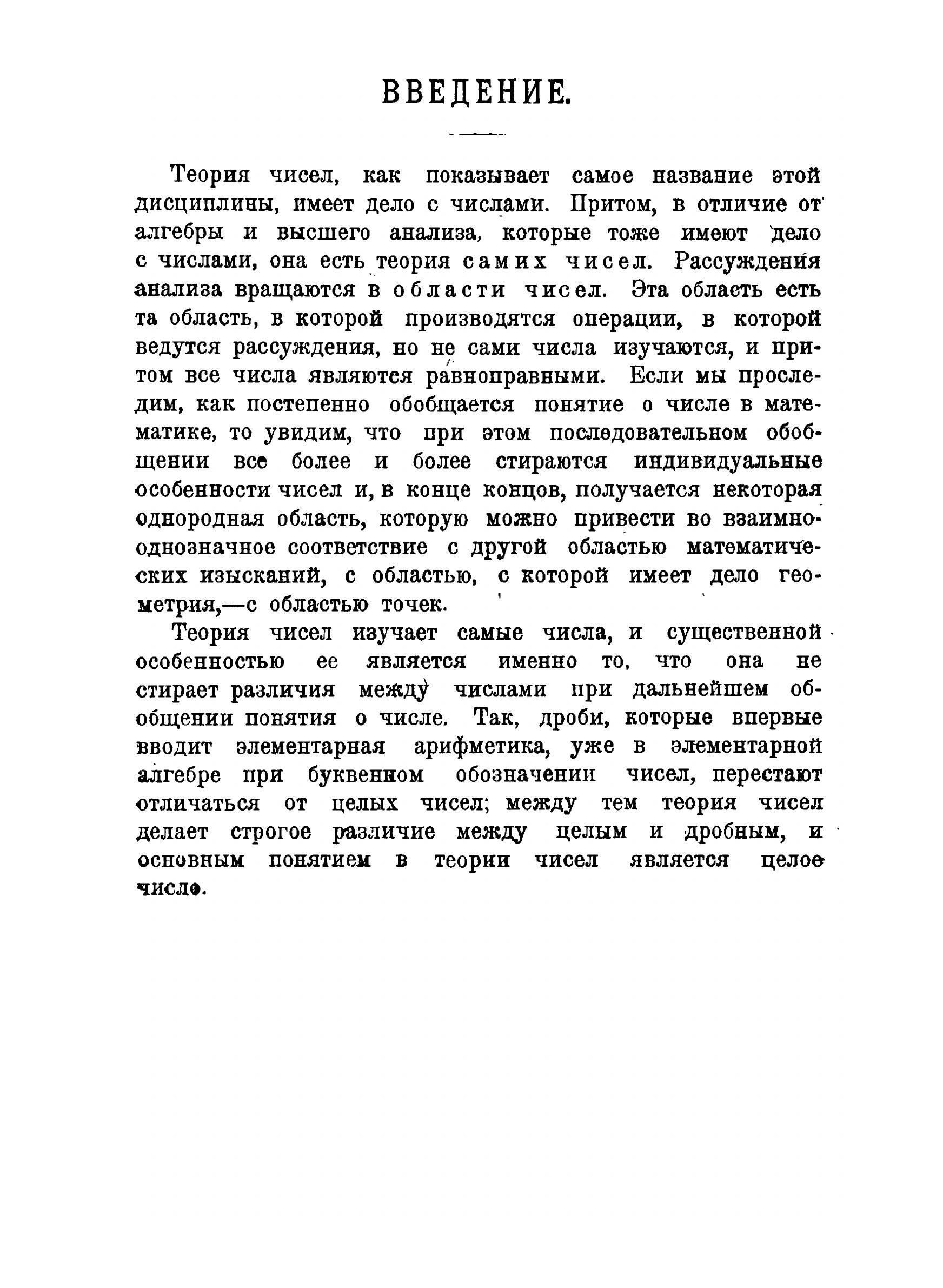 Предлагаемая книга имеет в своей основе курс лекций по теории чисел, которые автор в течение ряда лет читал в Московском Университете. Она содержит почти исключительно только самые основные результаты, вернее даже элементы теории чисел, как это можно усмотреть из самого заглавия; только последняя глава выходит несколько из области элементов и дает краткий очерк основных результатов арифметики многочленов, но и то я ограничиваюсь здесь почти всецело теми положениями теории, которые представляют полную аналогию с соответствующими теоремами элементарной арифметики и теории сравнений.