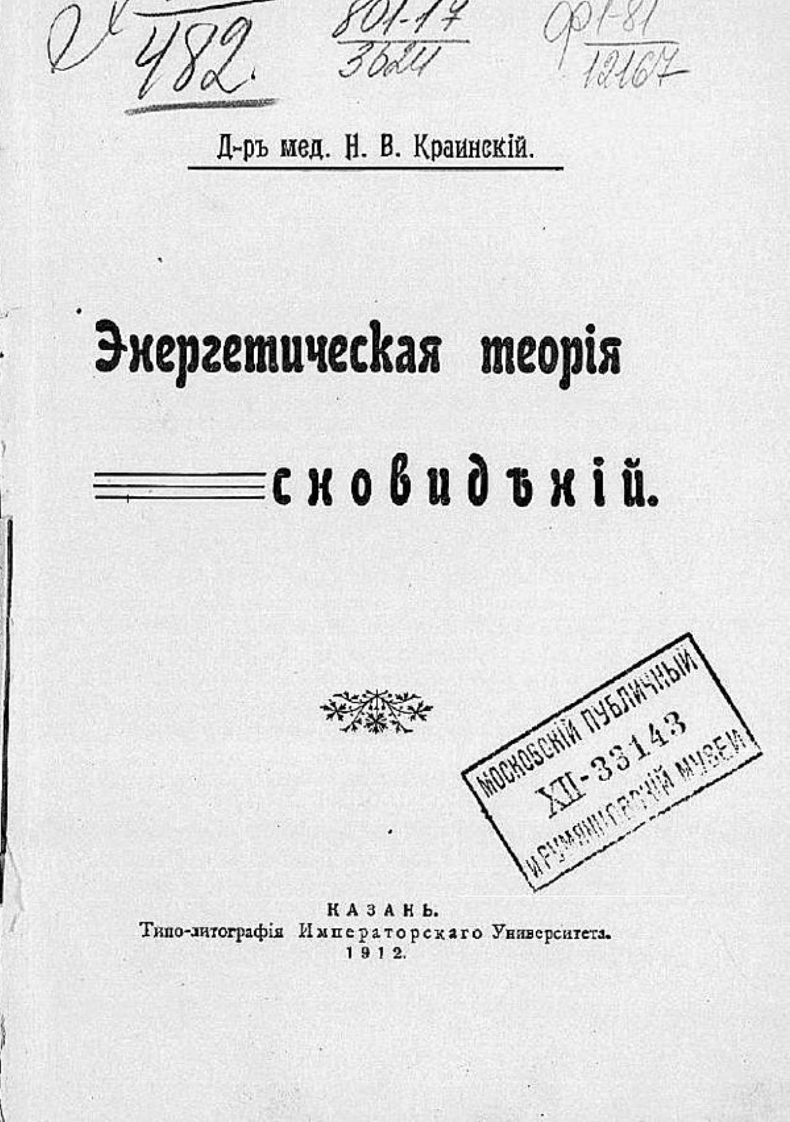 Краинский, Николай Васильевич (1869–). Энергетическая теория сновидений / Д-р мед. Н. В. Краинский. — Казань: Типо-лит. Имп. ун-та, 1912. — 65 с.; 25.