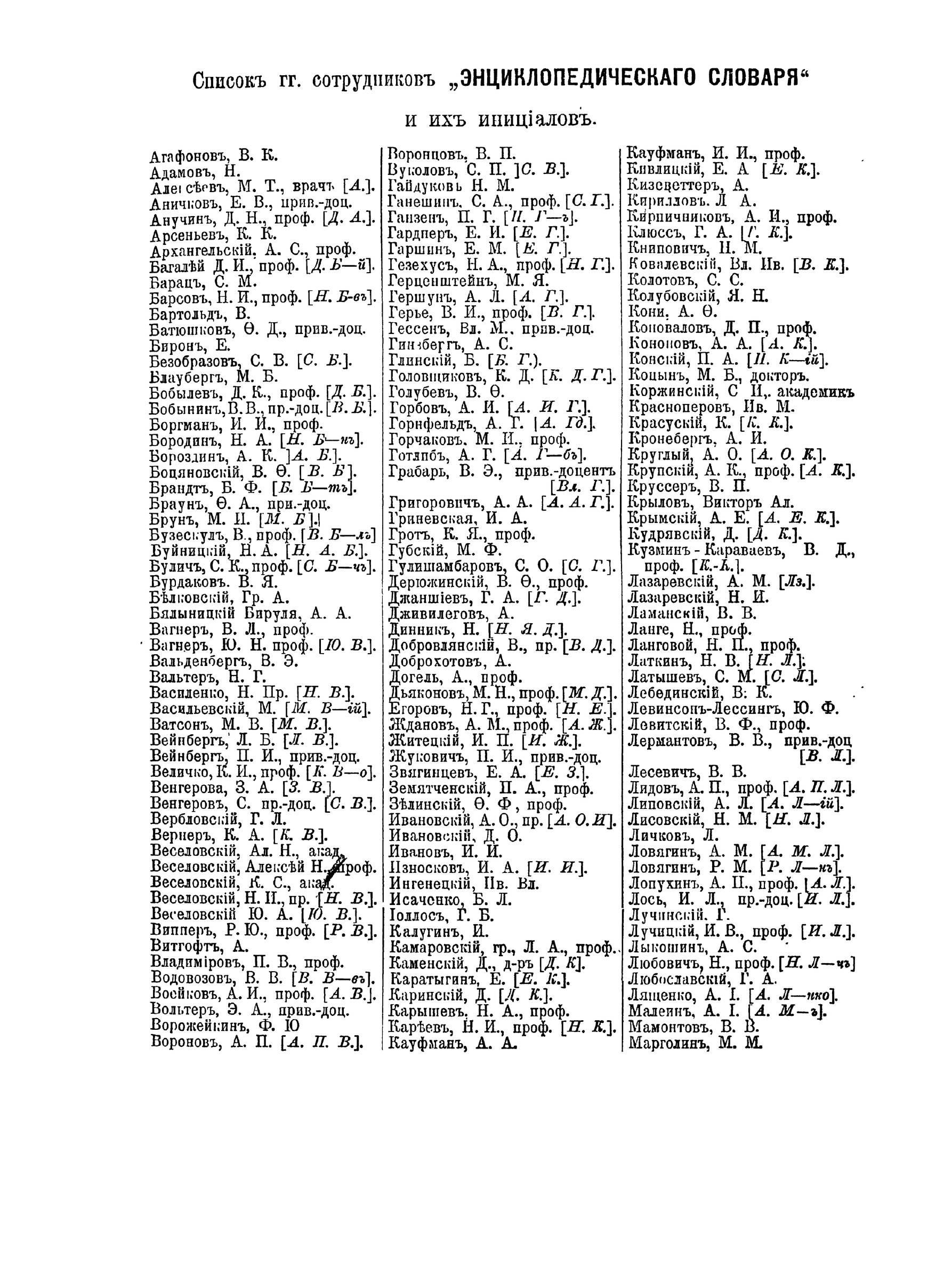 Самая крупная дореволюционная русская универсальная энциклопедия, выпущенная акционерным издательским обществом «Ф. А. Брокгауз — И. А. Ефрон». Состоит из 86 томов (82 основных и 4 дополнительных), выходивших в течение 1890-1907 годов. Первые 8 томов (до буквы «В») вышли под общей редакцией профессора И. Е. Андреевского и в основном содержали переводы на русский язык статей знаменитой немецкой энциклопедии Брокгауза «Konversations Lexikon». После кончины Андреевского новая редакция во главе с К. К. Арсеньевым и Ф. Ф. Петрушевским значительно увеличила число оригинальных статей и привлекла к сотрудничеству широкий круг общественно-политических деятелей либерального толка (от П. Н. Милюкова, В. И. Герье, Н. И. Кареева до легальных марксистов П. Б. Струве и М. И. Туган-Барановского, раздел философии вел крупнейший русский религиозный философ Вл. С. Соловьев), а также таких крупнейших ученых как Д. И. Менделеев, А. И. Бекетов, А. И. Воейков, Д. И. Анучин, Ю. М. Шокальский, Н. М. Книпович, А. О. Ковалевский, А. И. Советов, В. С. Соловьев и др.Ежегодно выходили в свет 4-5 томов.На сегодня Энциклопедический словарь Брокгауза и Ефрона является общественным достоянием: хотя в научно-техническом плане энциклопедия уже сильно устарела, многие её статьи по-прежнему представляют исключительную историческую ценность.