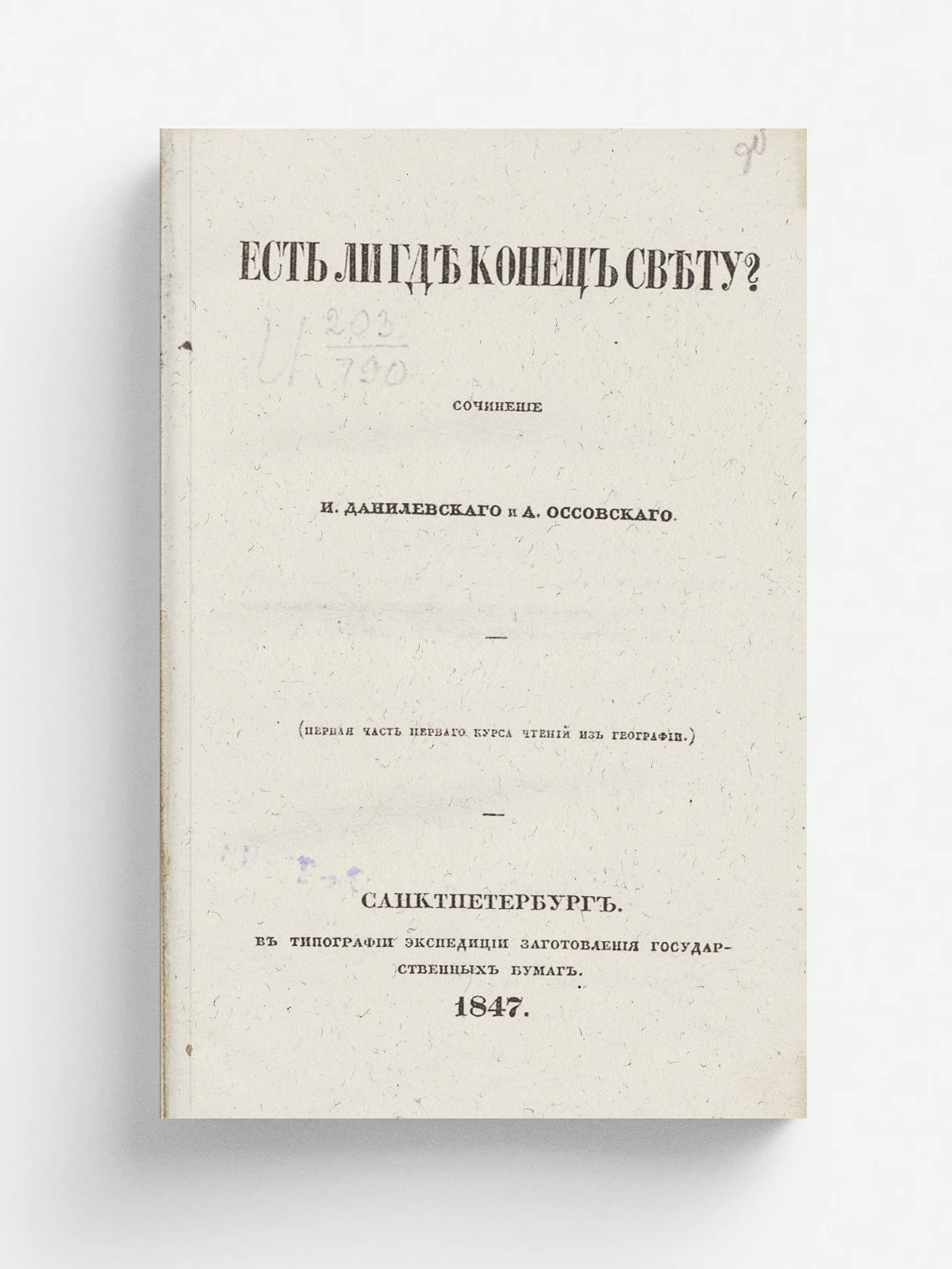 Данилевский, И. Есть ли где конец свету? / Соч. И. Данилевского и А. Оссовского. [Ч. 1]-4. — Санкт-Петербург : тип. Экспедиции заготовления гос. бумаг, 1847-1858. — 4 т.; 17. Первая часть первого курса чтений из географии. — 1847. — [2], 161,[1] с., 3 л. карт.