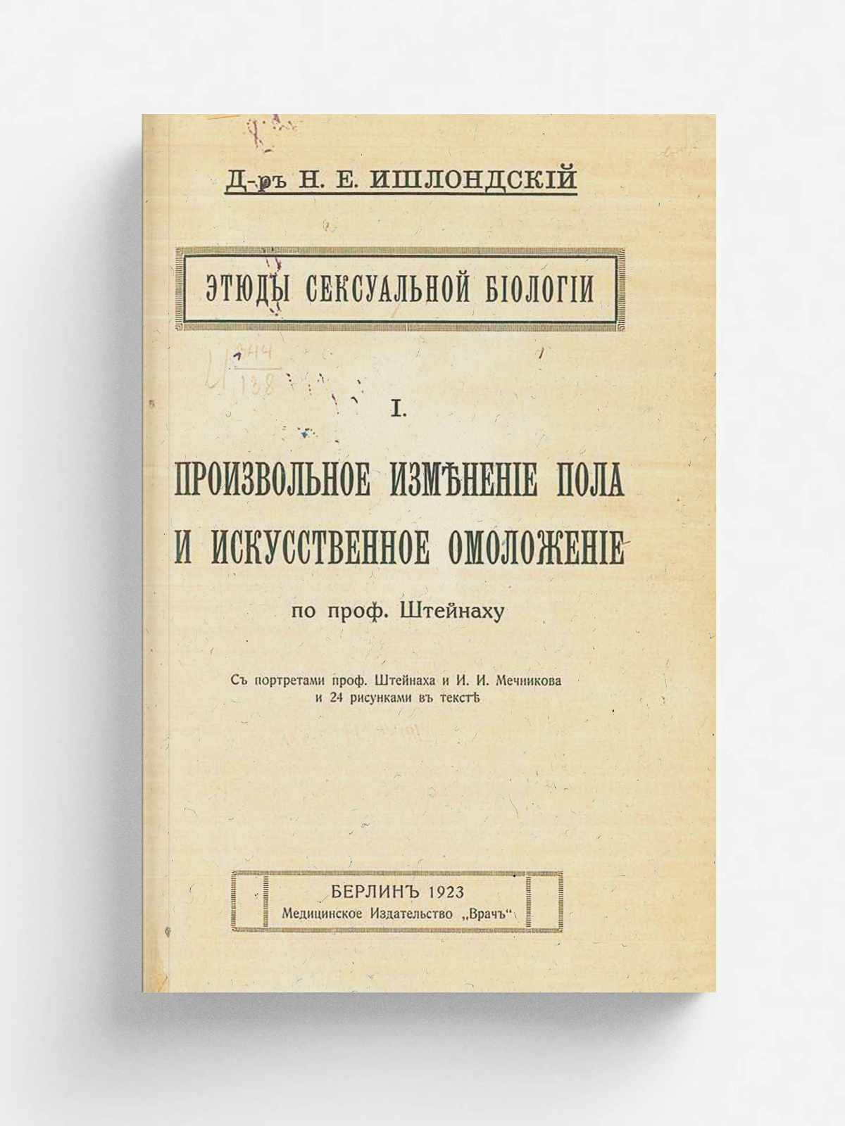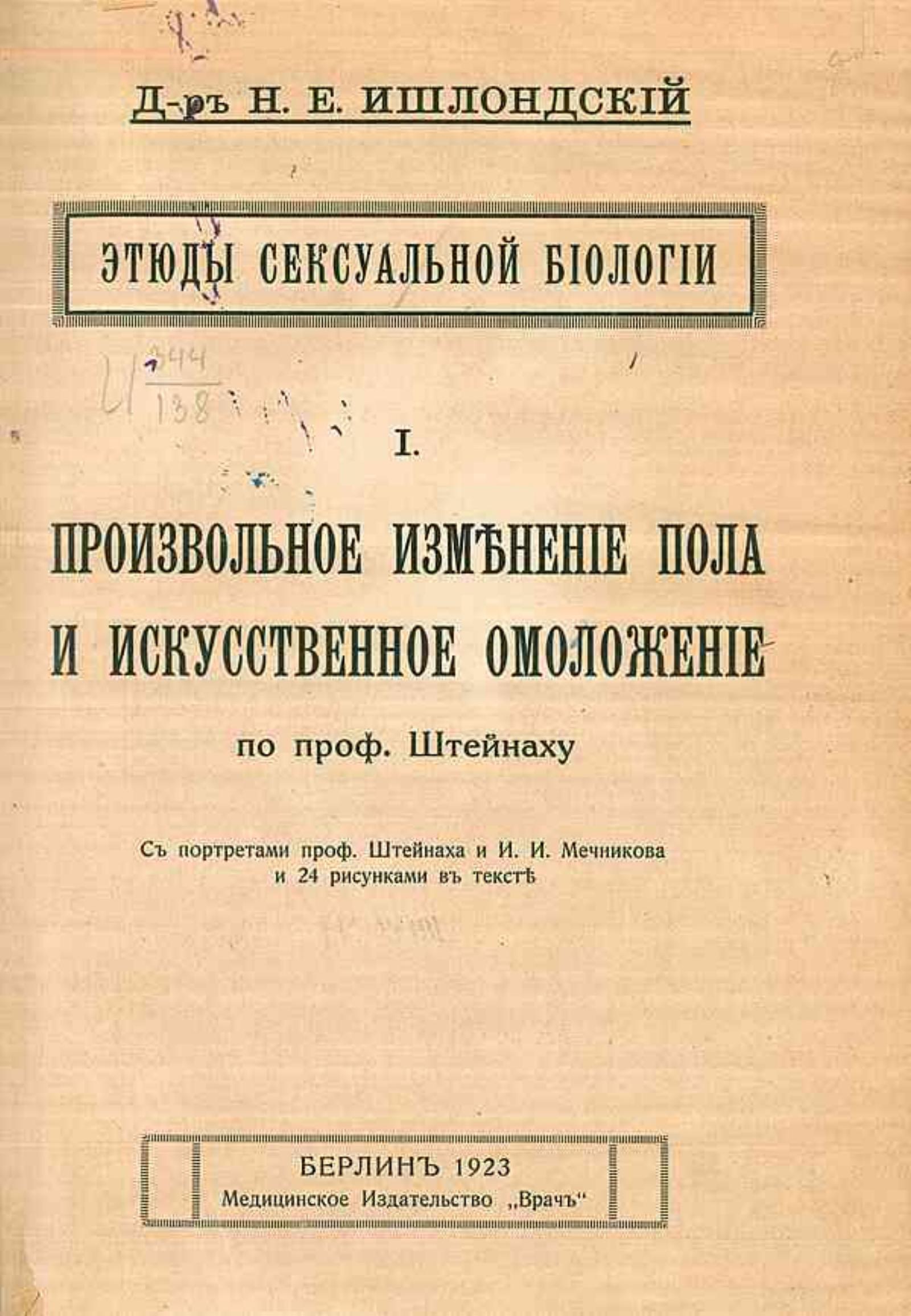 Ишлондский, Наум Ефимович. Этюды сексуальной биологии / Д-р Н. Е. Ишлондский. — Берлин : Врач, 1923. — 25 см. 1: Произвольное изменение пола и искусственное омоложение по профессору Штейнаху : С портр. проф. Штейнаха и И. И. Мечникова и 24 рис. в тексте. — Берлин : Врач, 1923. — 149 с. : ил., портр.
