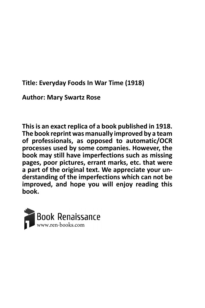 Печатная книга «Everyday Foods In War Time (1918)» в мягкой обложке, язык - английский. В книге 128 страниц, она напечатана на белой офсетной бумаге плотностью 80 г/м². Формат издания — 120x180 мм. Все книги аккуратно упаковываем в прочный трёхслойный непрозрачный картонный конверт.