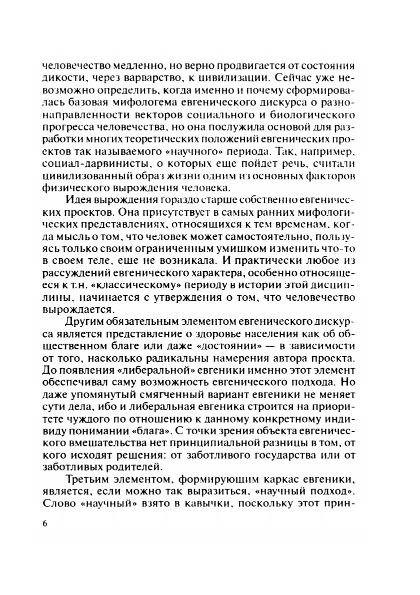 Настоящая монография посвящена философскому осмыслению идеи духовного и физического усовершенствования человека. В ней прослеживается эволюция евгенических представлений от базового мифа о Золотом веке и последующем вырождении человечества до социал-дарвинистских программ расовой гигиены рубежа XIX–XX вв. Исторический экскурс позволяет продемонстрировать отсутствие непосредственной связи между развитием науки (технологий) и содержанием прикладных евгенических программ. Актуальность темы обусловлена ростом интереса к евгенической проблематике в связи с достижениями в области генной инженерии и с обострением экологического кризиса.