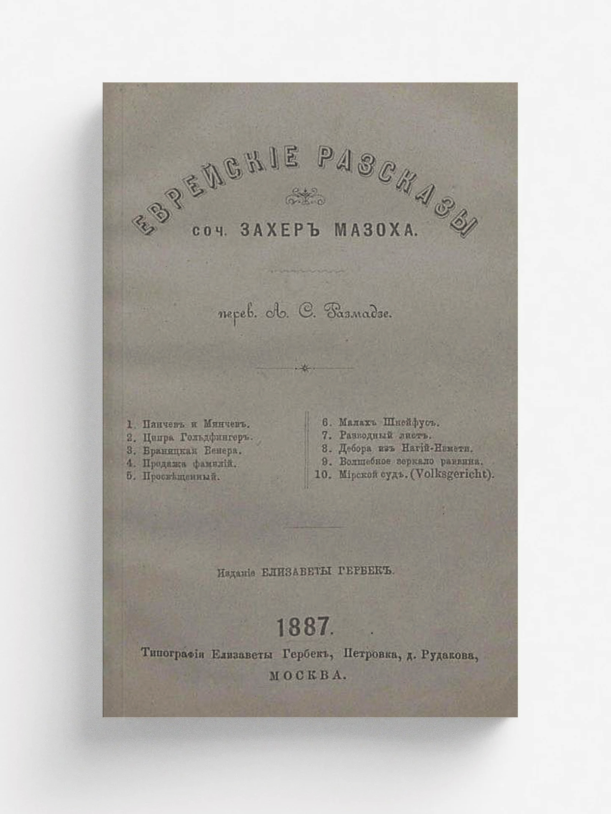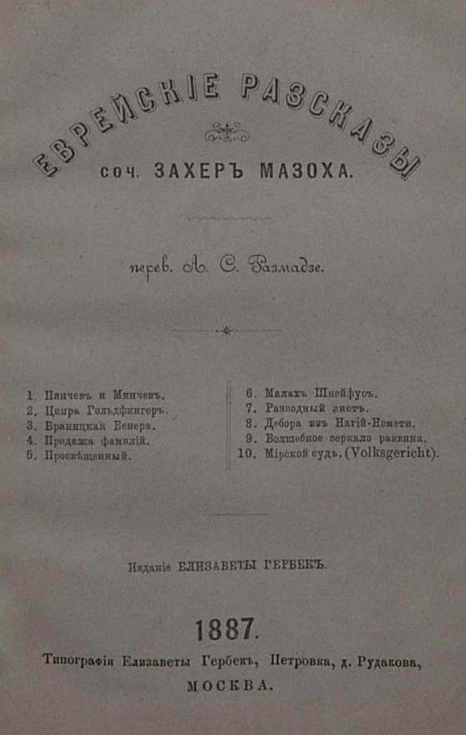 Захер-Мазох, Леопольд (1836–1895). Еврейские рассказы / Соч. Захер-Мазоха; Пер. А. С. Размадзе. — [Москва] : Е. Гербек, 1887. — [4], 308 с.; 17.