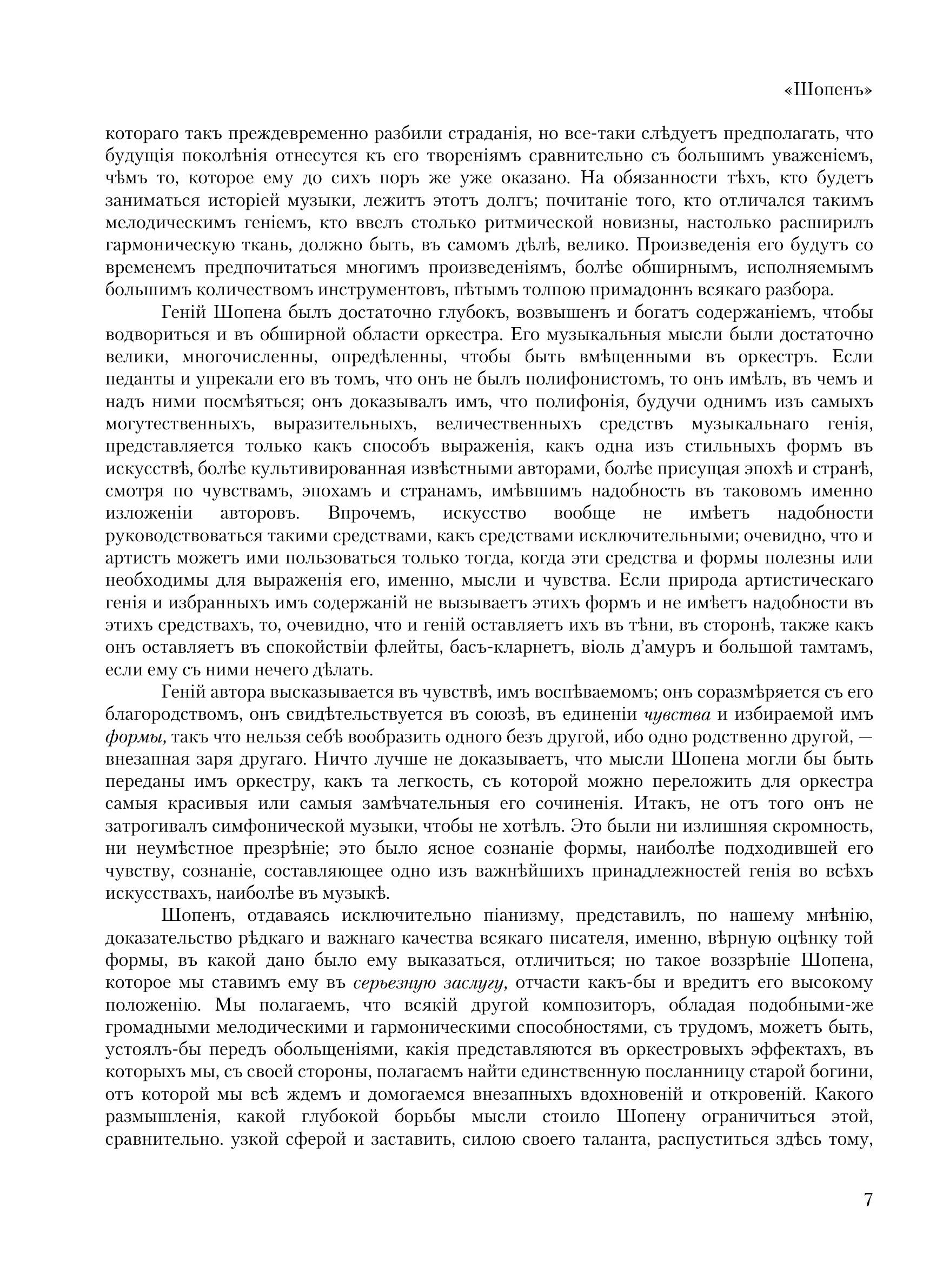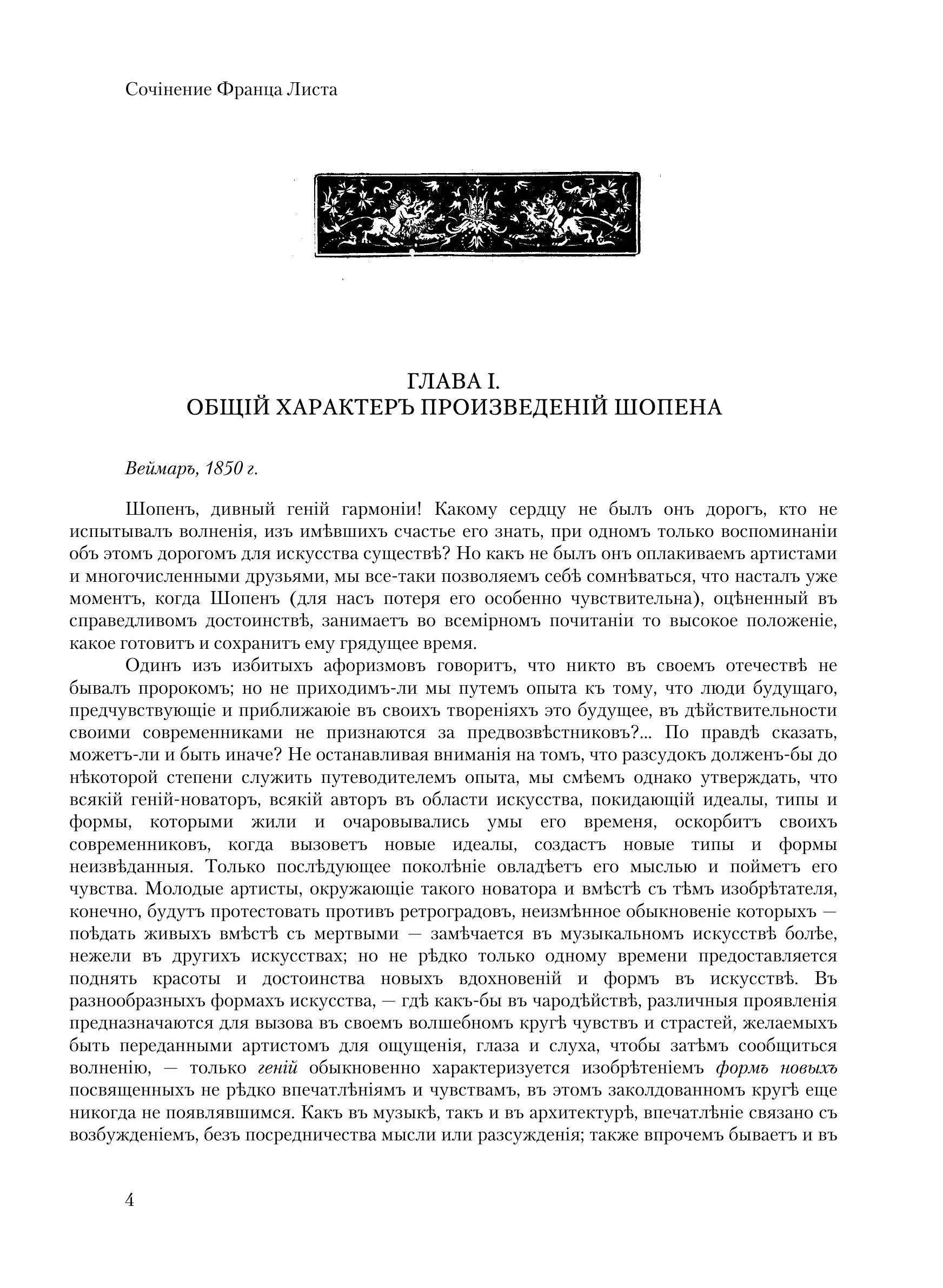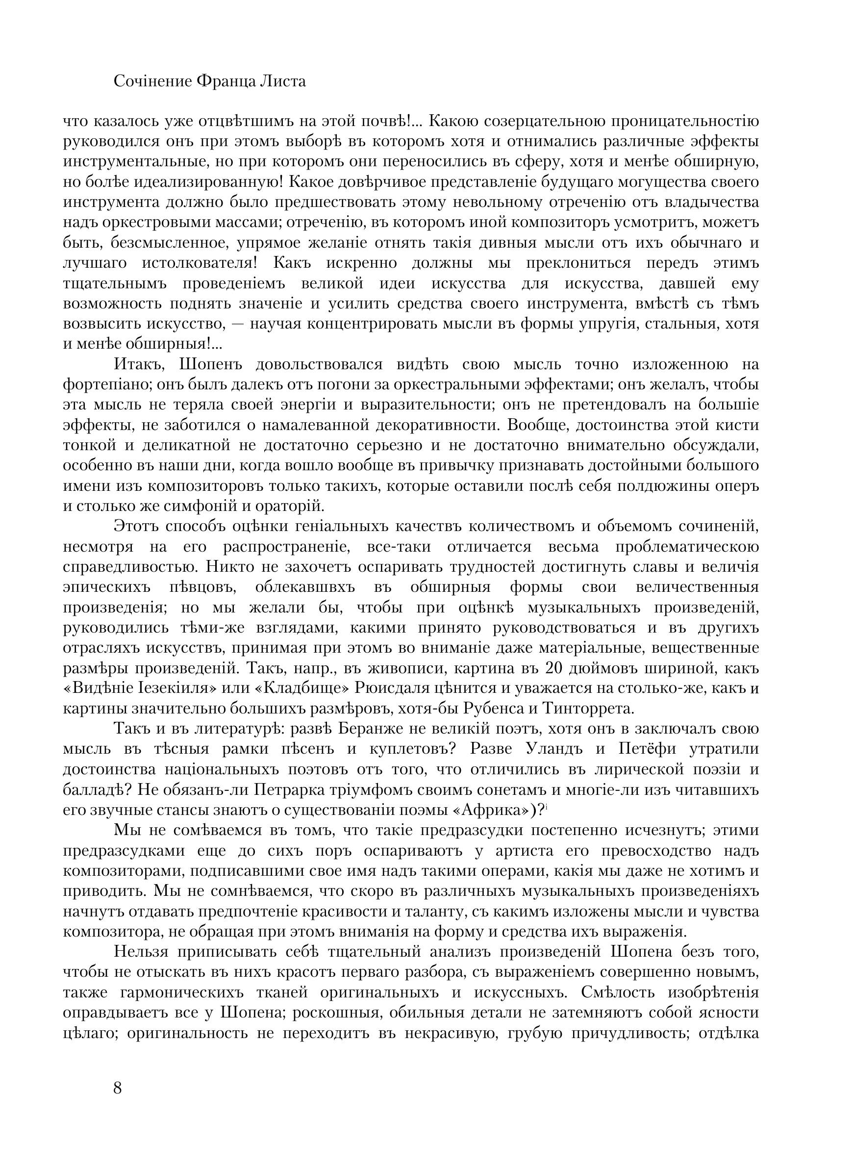 Среди книг, посвященных великим музыкантам, книга Листа о Шопене занимает совершенно особое место. Значение ее определяется прежде всего тем, что она написана не рядовым человеком – литератором, искусствоведом, критиком, – а истинно великим музыкантом-художником. Перед нами не просто книга о Шопене, а книга одного великого человека о другом, книга гения о гении. Больше того: перед нами своеобразнейший исторический и психологический документ эпохи. Это – взволнованная автобиографическая исповедь художника, остро чувствующего свое одиночество в буржуазном обществе и смело выступающего в защиту благородных идеалов прогресса и гуманизма. Можно сказать без преувеличения, что из всего написанного художниками о художниках вряд ли найдется еще книга, в которой бы с такой любовью и преданностью, с таким пылким воодушевлением и вместе с тем с такой удивительной проницательностью и откровенностью один гений высказался о другом.