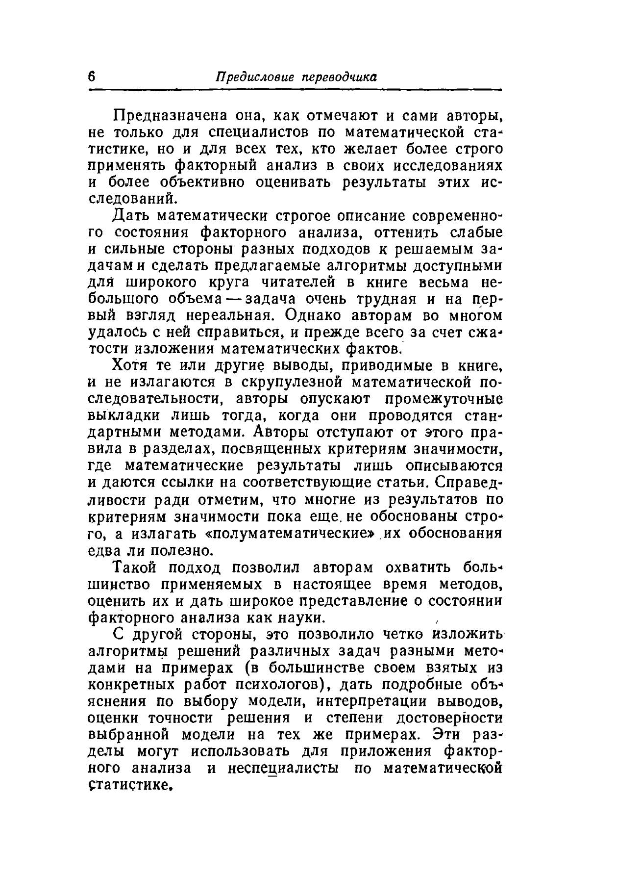 Настоящая монография даёт чёткое представление о задачах факторного анализа, который находит всё большее применение при решении различных практических задач. Факторный анализ возник и развивался в связи с решением в первую очередь задач психологии (например, объяснение успеваемости учеников). Однако область его приложений значительно шире и охватывает в принципе все случаи применения многомерного статистического анализа.