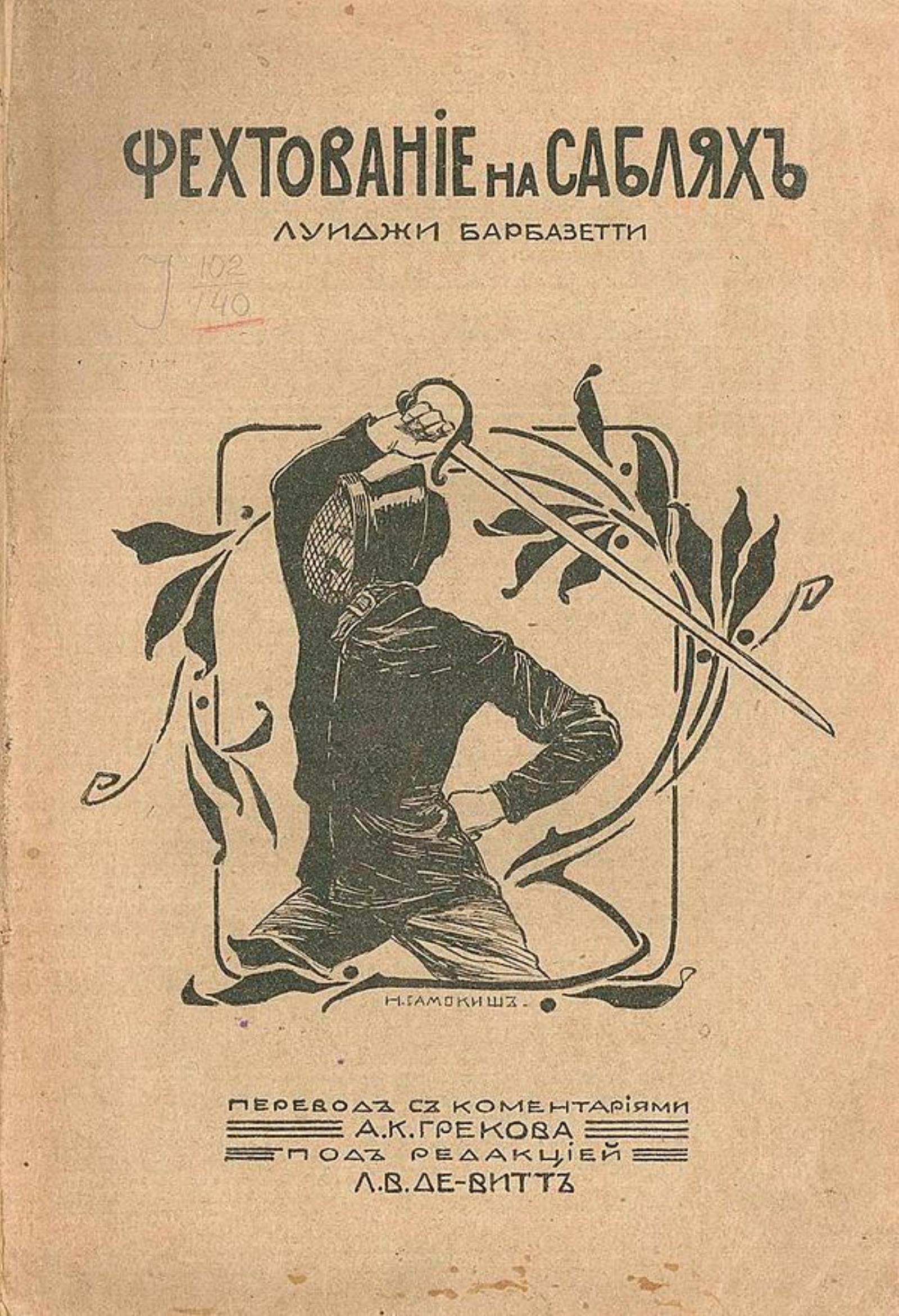 Барбазетти, Луиджи. Фехтование на саблях / Луиджи Барбазетти; Пер. с коммент. А. К. Грекова, под ред. Л. В. Де-Витт. — Санкт-Петербург: изд. при содействии С.-Петерб. офиц. фехтов. гимнаст. зала, 1909. — 166, II с. : ил.; 23.