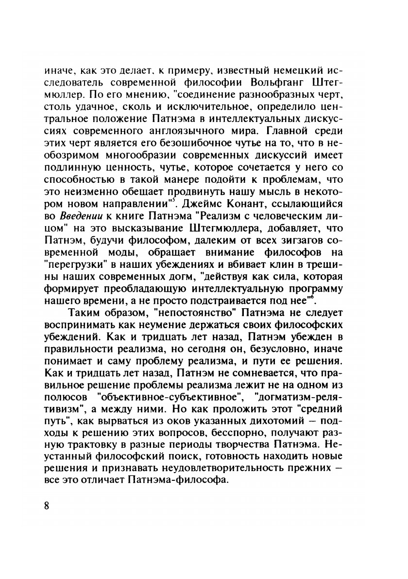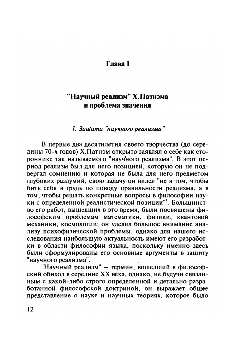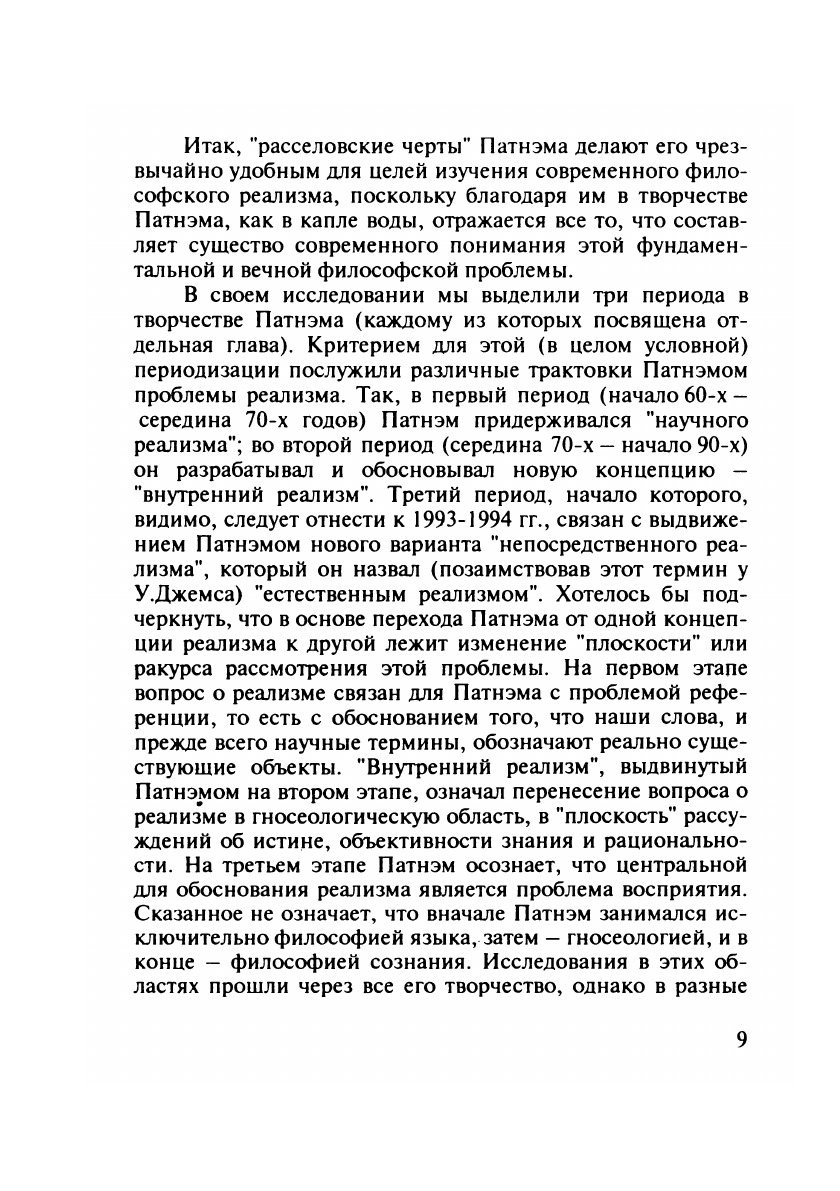 Работа посвящена известному философу США Хилари Патнэму (род. в 1926 г.), чьи идеи и творческие поиски в немалой степени определяют "лицо" американской философии наших дней. Выбрав в качестве связующей темы в творчестве этого философа его исследования по проблеме реализма, автор выявляет внутреннюю логику в эволюции его взглядов (от "научного реализма" к концепции "внутреннего реализма" и к реализму здравого смысла) и показывает соотнесенность этой проблемы с широким спектром изысканий Патнэма в методологии науки, философии языка, гносеологии и философии сознания. Изложенный в работе материал позволяет составить общее представление о современных подходах и методах решения одного из центральных философских вопросов – проблемы реализма.