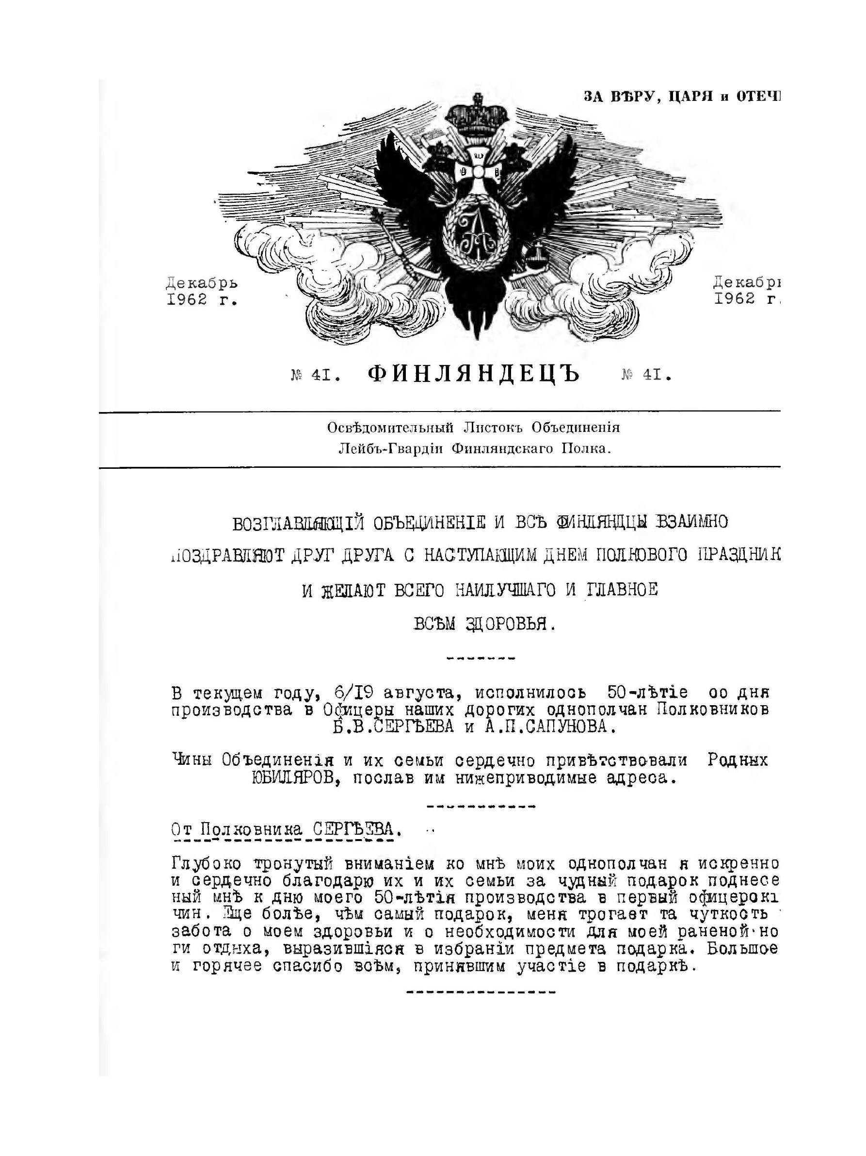 Один из редчайших (возможно, самый редкий) журналов русской эмиграции. Тираж колебался от 40 до 100 экземпляров. Номер 41-й вышел тиражом 50 экземпляров. Поздравления по случаю полкового праздника. - Поздравления полковникам Б.Сергееву и А.Сапунову по случаю 50-летия производства в офицеры. - Б.Сергеев: Участие Л.Гв.Финляндского полка в войне 1812 г. ( К ее 150-летию). - Б.Сергеев: Бородино, Красное, Березина. (Еретические мысли.).- Ходнев Д. : Из далекого прошлого.(Московский Кадетский корпус. 1902 - 1903 гг.) - А.Работин: Из воспоминаний. (Воронеж в гражданскую войну). - Объявления, Оповещения, Хроника. Париж 1962-1971 гг.