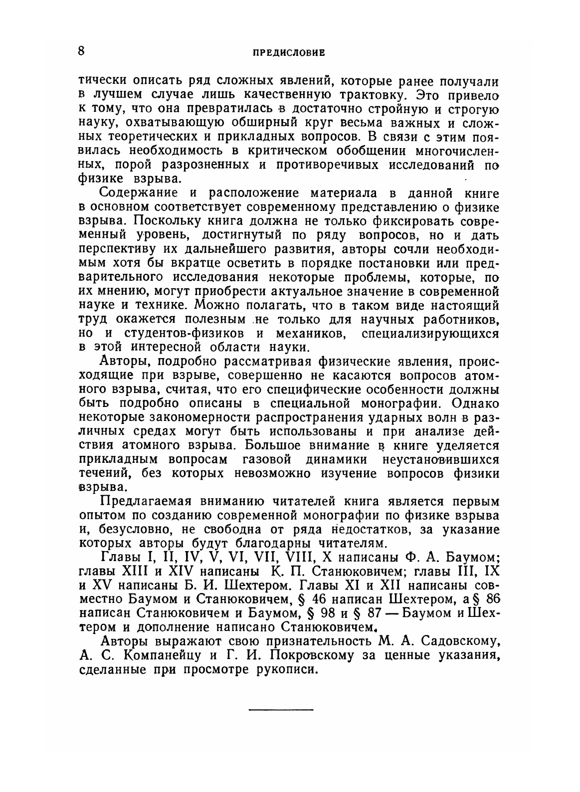 В книге в систематизированном виде изложен комплекс вопросов, посвященных закономерностям превращений взрывчатых веществ и действию взрыва в разных средах. В ней с достаточной полнотой рассмотрены общие свойства взрывчатых веществ и условия их превращения в зависимости от различных физико-химических факторов, процессы детонации и горения. Изложены вопросы бризантного и фугасного действия взрыва, подробно рассмотрена теория кумуляции. Большое внимание уделено прикладной газовой динамике неустановившихся течений. Книга рассчитана на специалистов, работающих в области теории и практики взрыва, может явиться полезным пособием для студентов и аспирантов, специализирующихся в этой области.