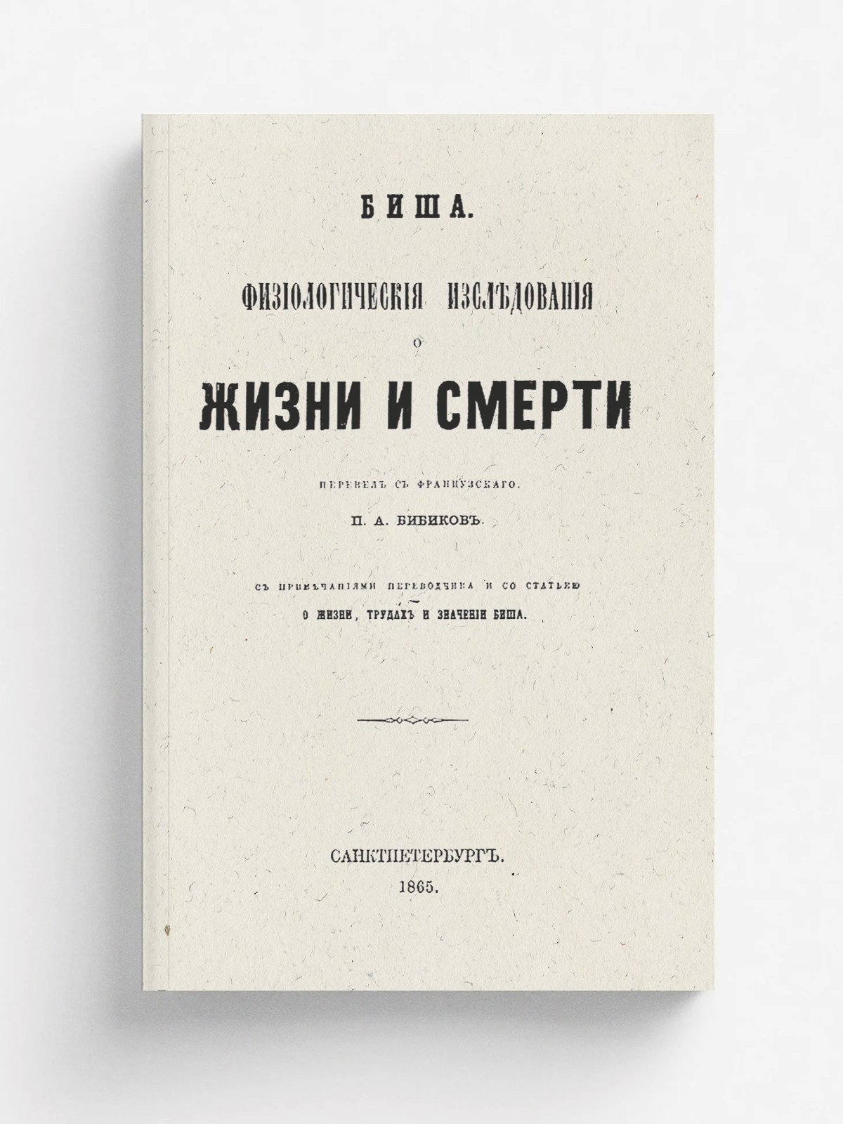 Биша, Мари Франсуа Ксавье (1771–1802). Физиологические исследования о жизни и смерти : С прим. пер. и со ст. «О жизни, трудах и значении Биша» / Пер. с фр. П. А. Бибиков. — Санкт-Петербург : тип. И. И. Глазунова, 1865. — LVIII, 458 с.; 22.