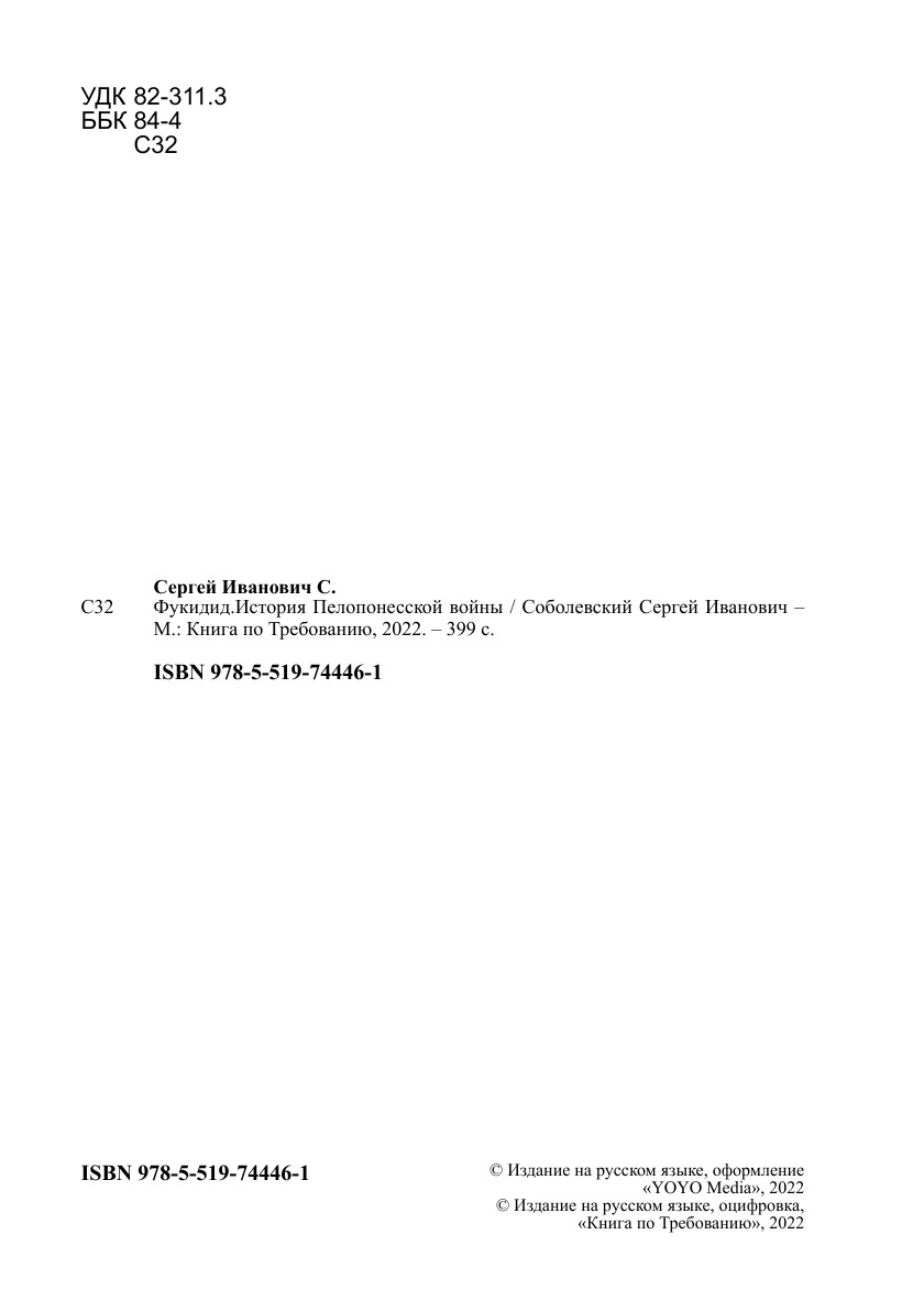 Печатная книга «Фукидид.История Пелопонесской войны» в мягкой обложке, язык - русский. В книге 399 страниц, она напечатана на белой офсетной бумаге плотностью 80 г/м². Формат издания — 148x210 мм. Все книги аккуратно упаковываем в прочный трёхслойный непрозрачный картонный конверт.