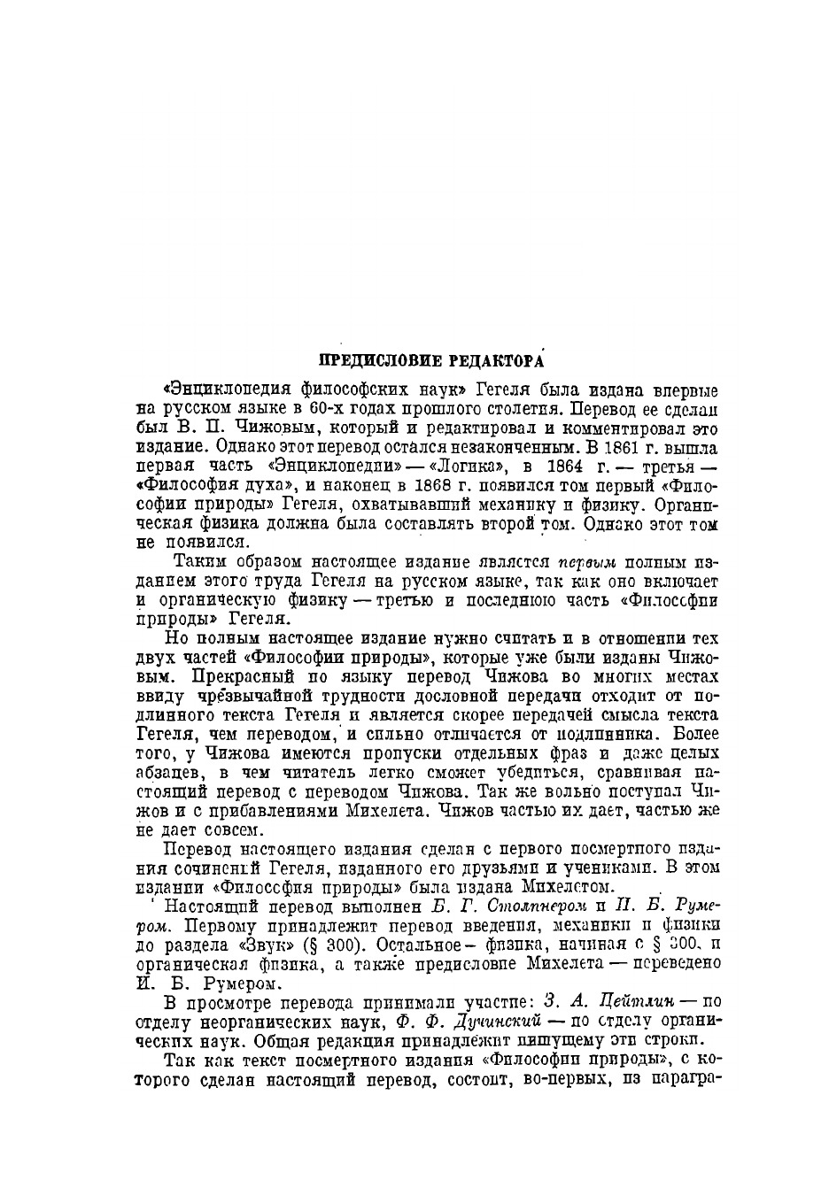 "Энциклопедия философских наук" Гегеля была издана впервые на русскому языке в 60-х годах прошлого столетия. Перевод ее сделан был В. П. Чижовым, который и редактировал и комментировал это издание. Однако этот перевод остался незаконченным. В 1861 г. вышла первая часть "Энциклопедии" - "Логика", в 1864 г. - третья - "Философия духа", и наконец в 1868 г. появился том первый "Философии природы".