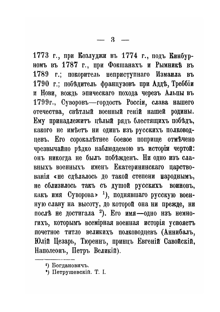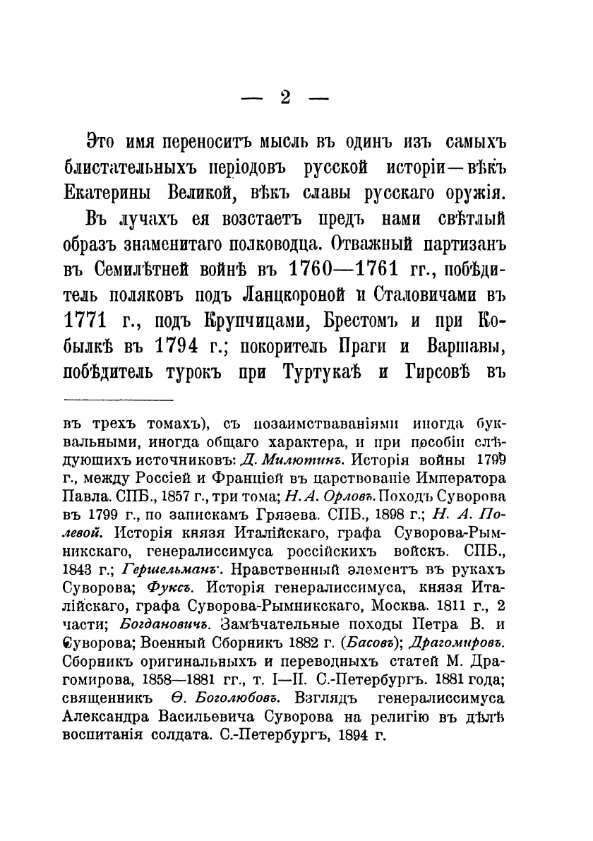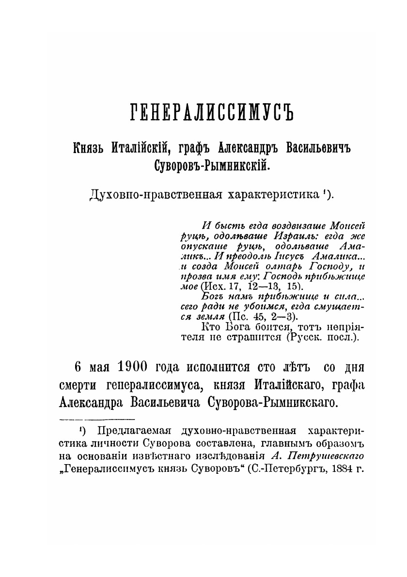Генералиссимус, Князь Италийский, Граф Александр Васильевич Суворов-Рымникский, будучи великим полководцем, вместе с тем, был и великим Христианином. Славны воинские его подвиги, высоки и Христианския добродетели. Молитвою начинал и оканчивал он каждый день, каждое дело, каждую борьбу с неприятелем.