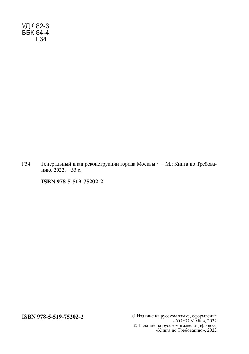Печатная книга «Генеральный план реконструкции города Москвы» в мягкой обложке, язык - русский. В книге 53 страниц, она напечатана на белой офсетной бумаге плотностью 80 г/м². Формат издания — 148x210 мм. Все книги аккуратно упаковываем в прочный трёхслойный непрозрачный картонный конверт.