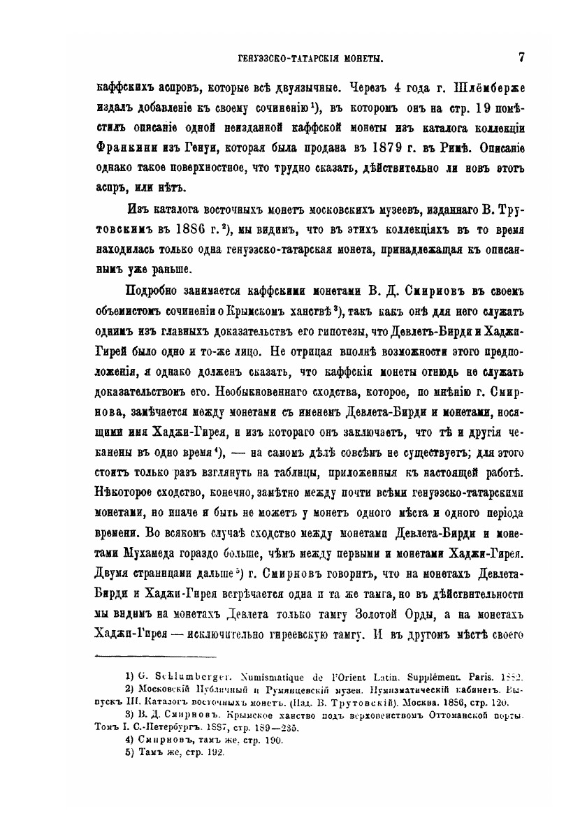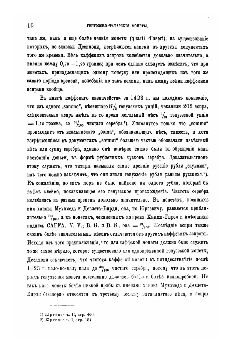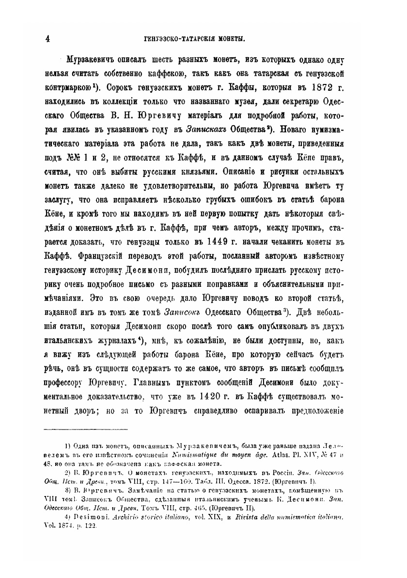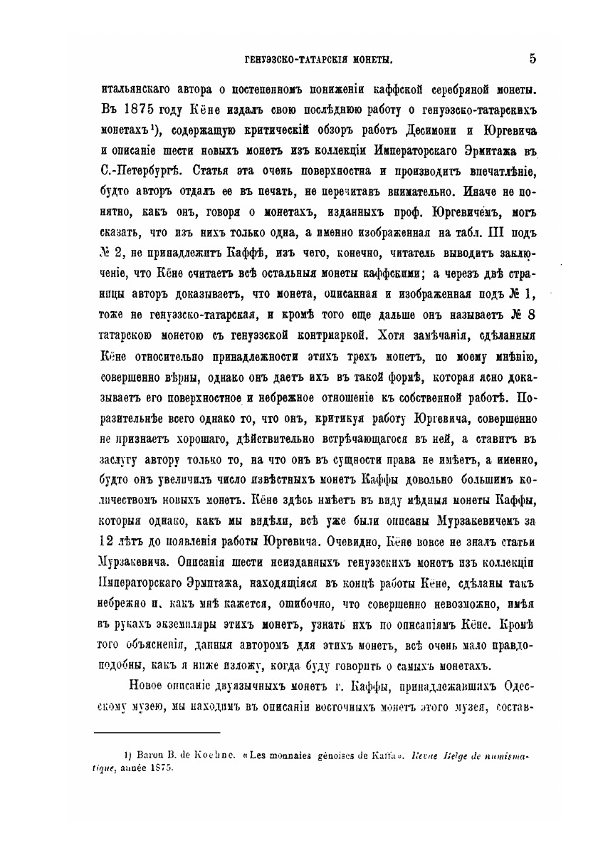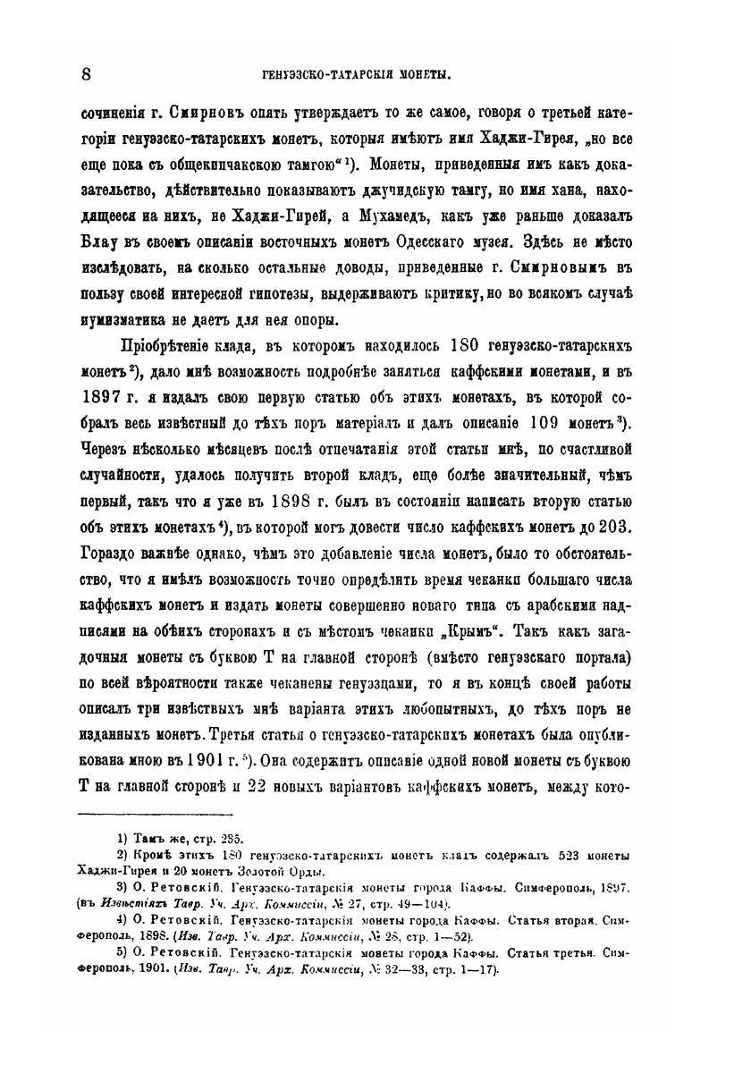 Данный труд Отто Фердинандовича Ретовского посвящен описанию и классификации генуэзско-татарских монет. Под данным понятием в книге объединяются монеты Каффы (генуэзского города, располагавшегося в районе современной Феодосии), монеты с местом чеканки «Крым» и монеты с буквой «Т» на лицевой стороне.