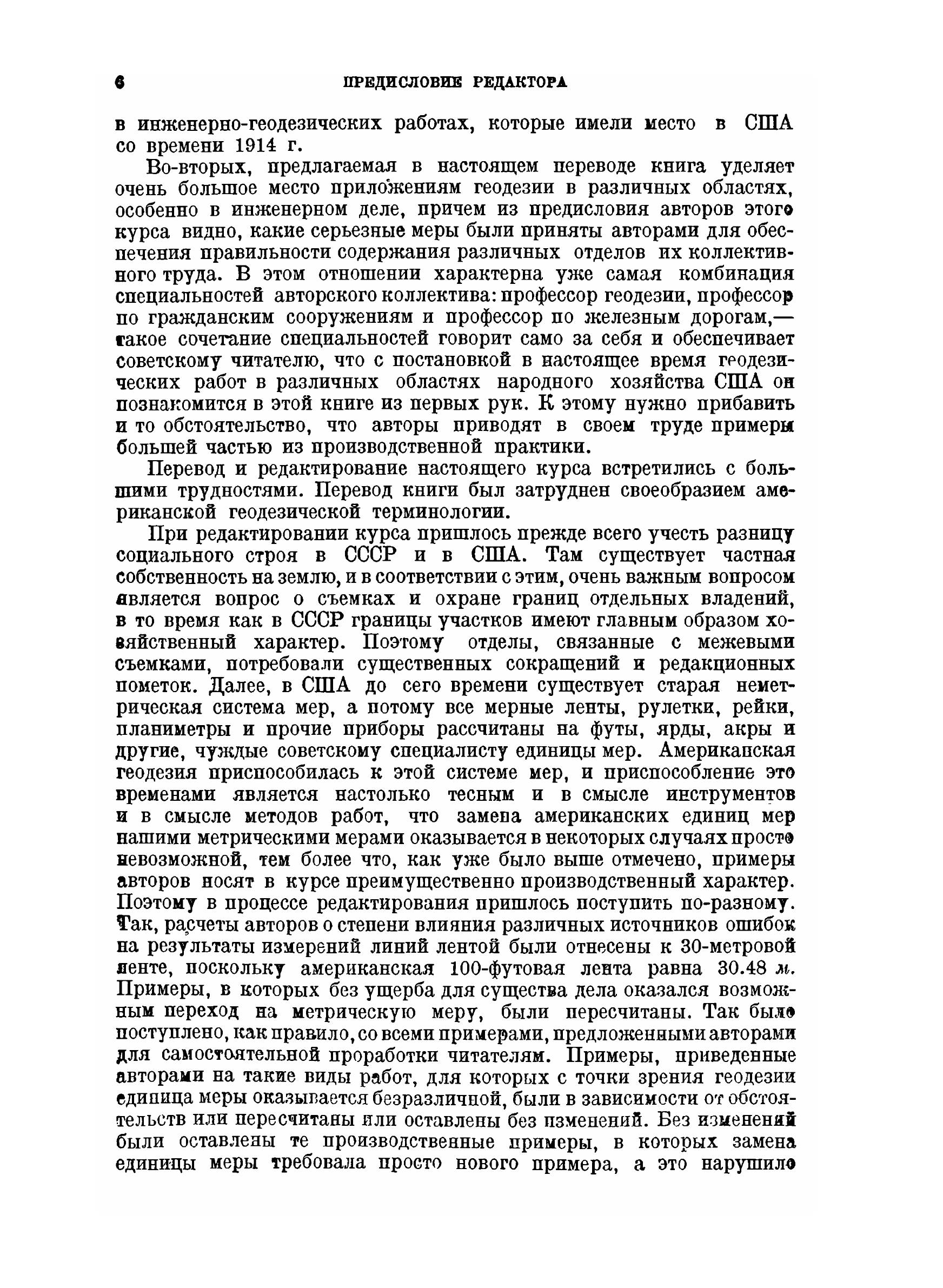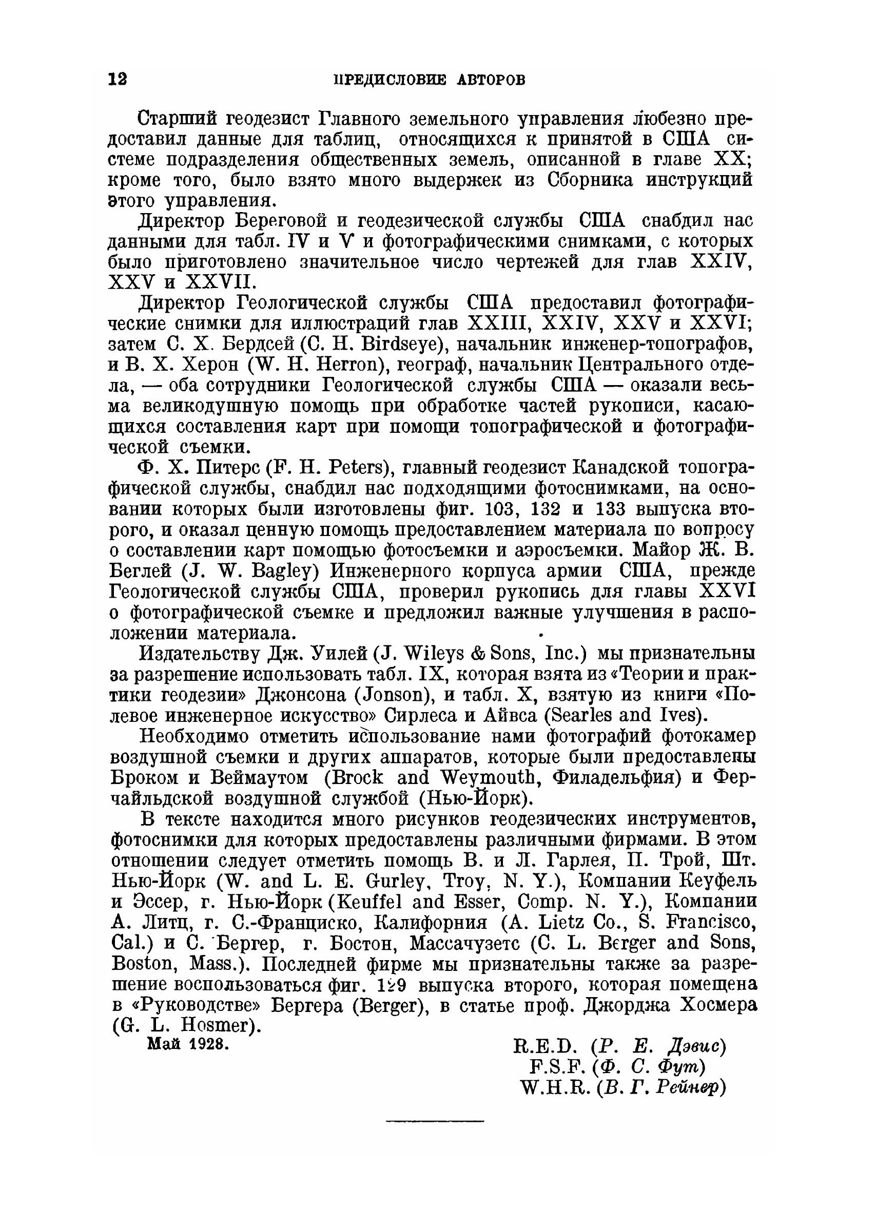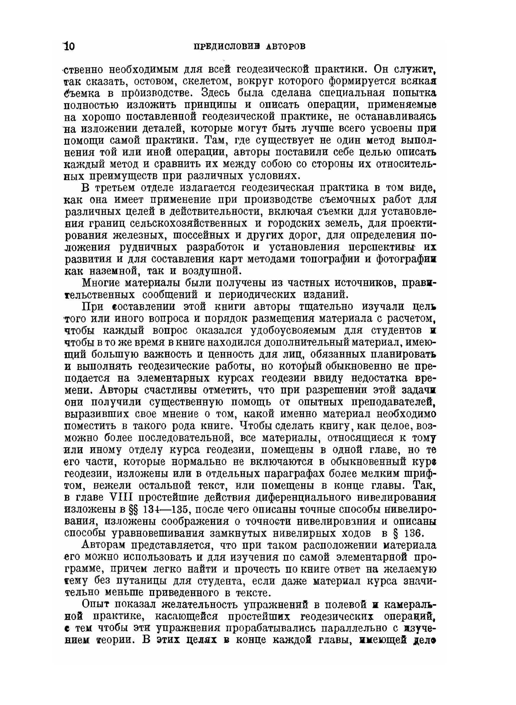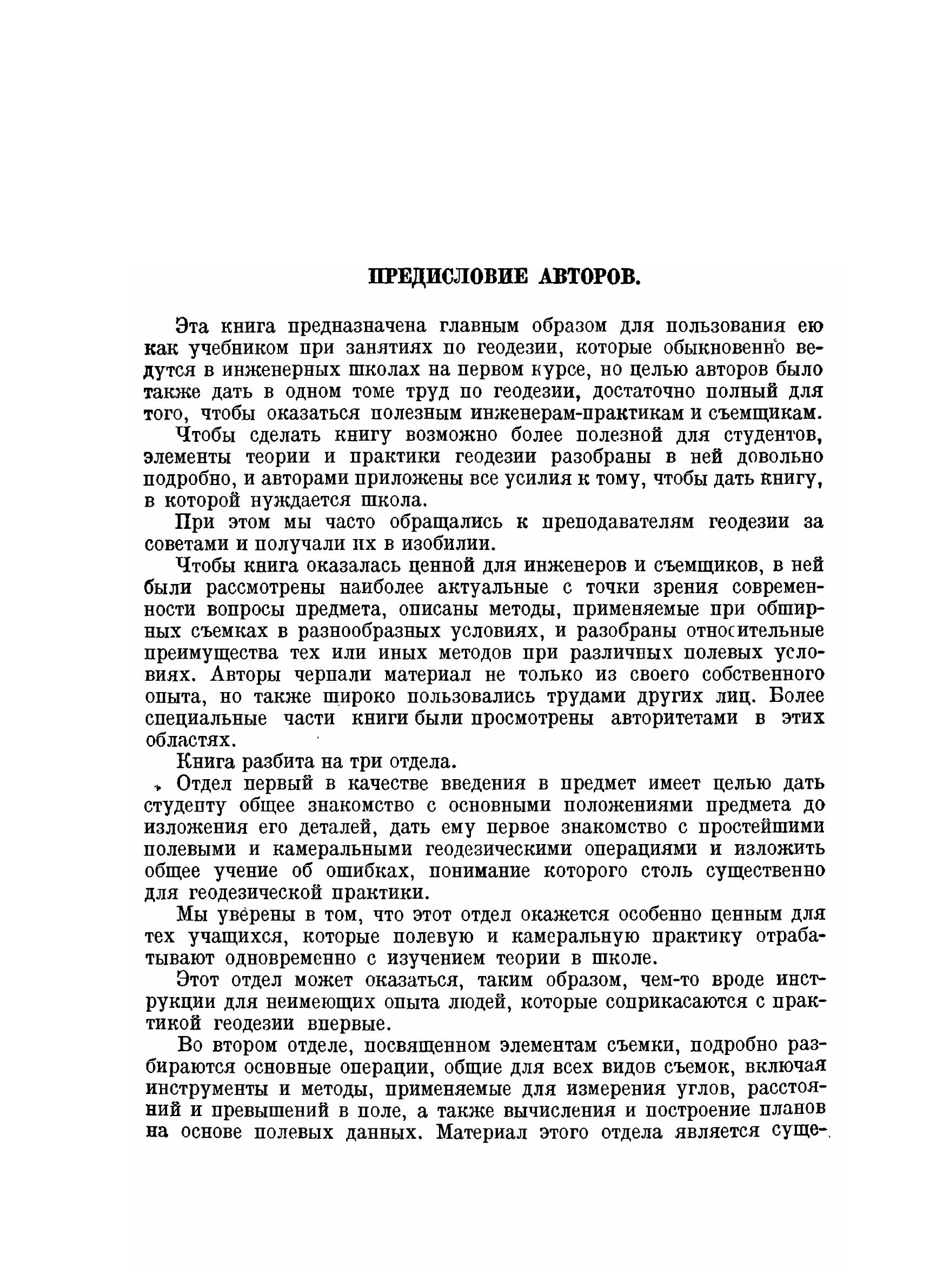 Эта книга предназначена главным образом для пользования ею как учебником при занятиях по геодезии, которые обыкновенно ведутся в инженерных школах на первом курсе, но целью авторов было также дать в одном томе труд по геодезии, достаточно полный для того, чтобы оказаться полезным инженерам-практикам и съемщикам. Чтобы сделать книгу возможно более полезной для студентов, элементы теории и практики геодезии разобраны в ней довольно подробно, и авторами приложены все усилия к тому, чтобы дать книгу, в которой нуждается школа. Чтобы книга оказалась ценной для инженеров и съемщиков, в ней были рассмотрены наиболее актуальные с точки зрения современности вопросы предмета, описаны методы, применяемые при обширных съемках в разнообразных условиях, и разобраны относительные преимущества тех или иных методов при различных полевых условиях. Авторы черпали материал не только из своего собственного опыта, но также широко пользовались трудами других лиц. Более специальные части книги были просмотрены авторитетами в этих областях