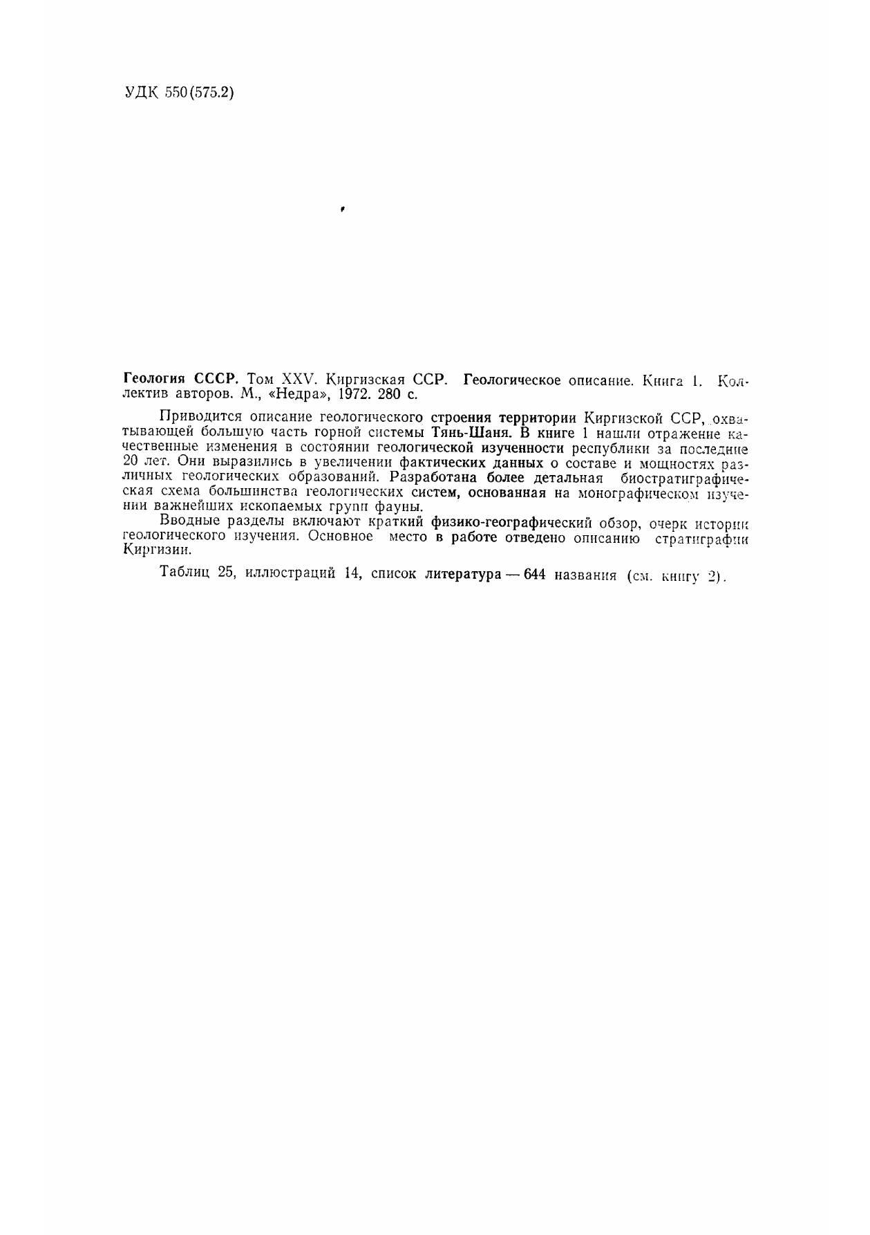 Приводится описание геологического строения территории Киргизской ССР, охватывающей большую часть горной системы Тянь-Шаня. В книге 1 нашли отражение качественные изменения в состоянии геологической изученности республики за последние 20 лет. Они выразились в увеличении фактических данных о составе и мощностях различных геологических образований. Разработана более детальная биостратиграфическая схема большинства геологических систем, основанная на монографическом изучении важнейших ископаемых групп фауны.Вводные разделы включают краткий физико-географический обзор, очерк истории геологического изучения. Основное место в работе отведено описанию стратиграфии Киргизии.