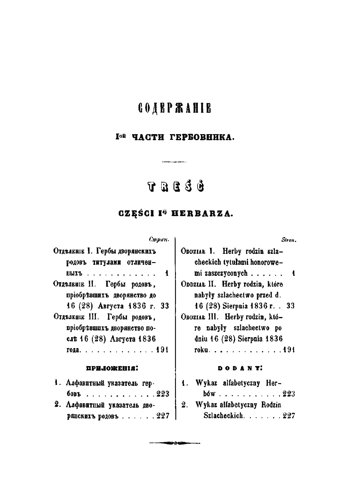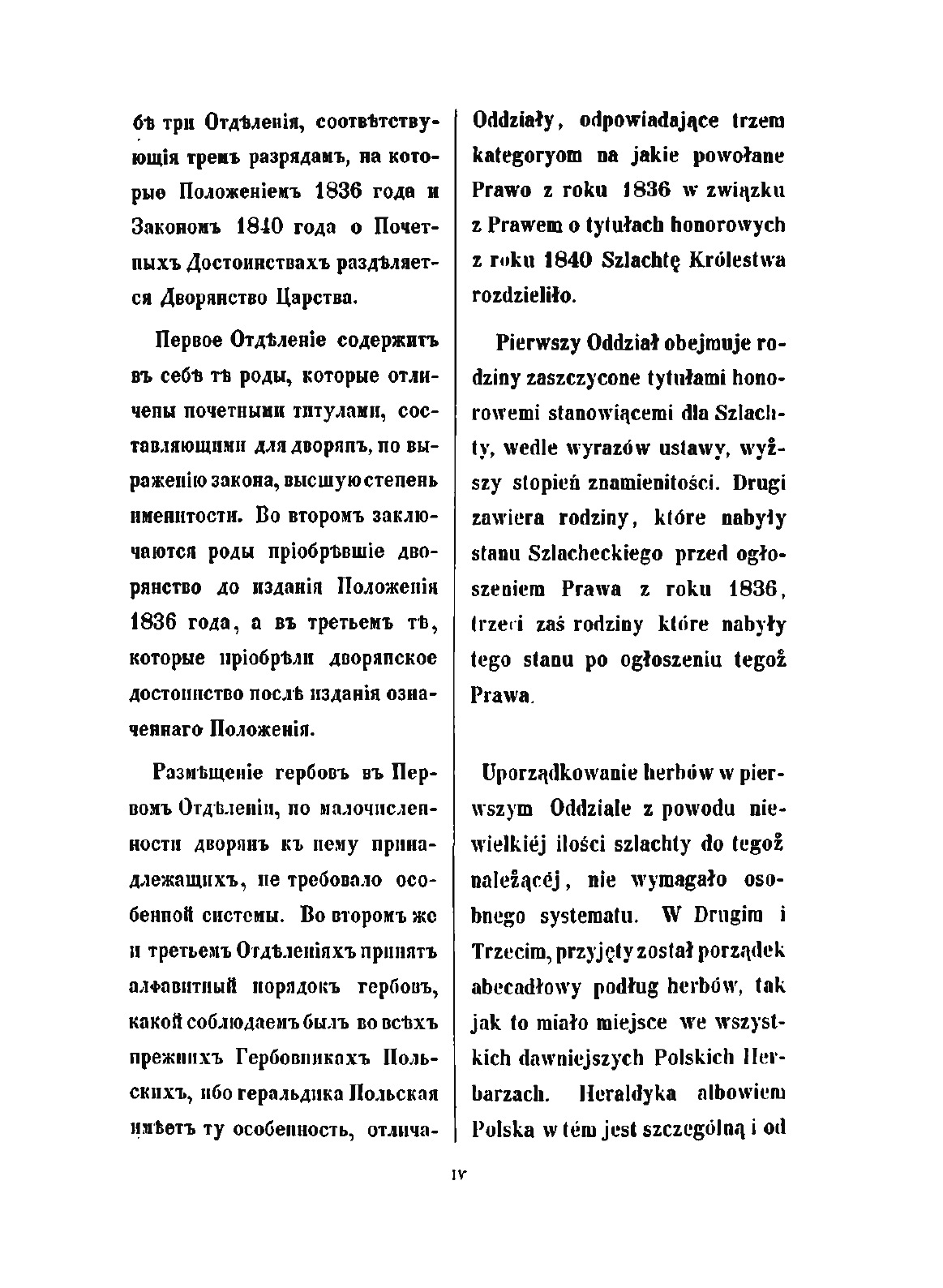 Положением о дворянстве в Царстве Польском, высочайше утвержденном 25 июня 1836 г., а также в соответствии с 65-й статьей этого Положения, составление Гербовника польского дворянства было возложено на Герольдию. В результате кропотливой и длительной работы к 1850 году было разработано и описано 135 гербов, относящихся к 389 польским фамилиям. Все польское дворянство было распределено на три части: титулованные дворянские семьи, фамилии, получившие дворянство до 1836 года и, наконец, причисленные к благородному сословию семьи после 1836 года. Среди польской знати особо выделены два княжеских и свыше ста графских родов. Текст описаний опубликован одновременно на русском и польском языках. Репринтное издание по технологии print-on-demand с оригинала 1853 года