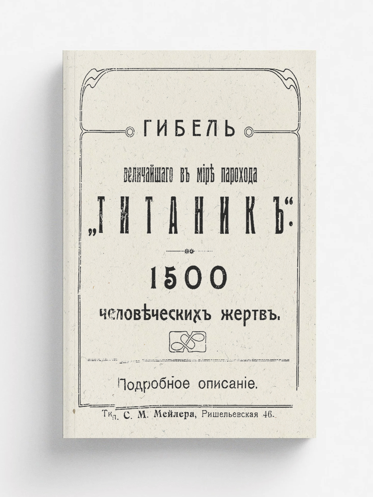 Гибель величайшего в мире парохода «Титаник». 1500 человеческих жертв. Подробное описание. — [Одесса] : тип. С. М. Мейлера, 1912. — 16 с.; 19.
