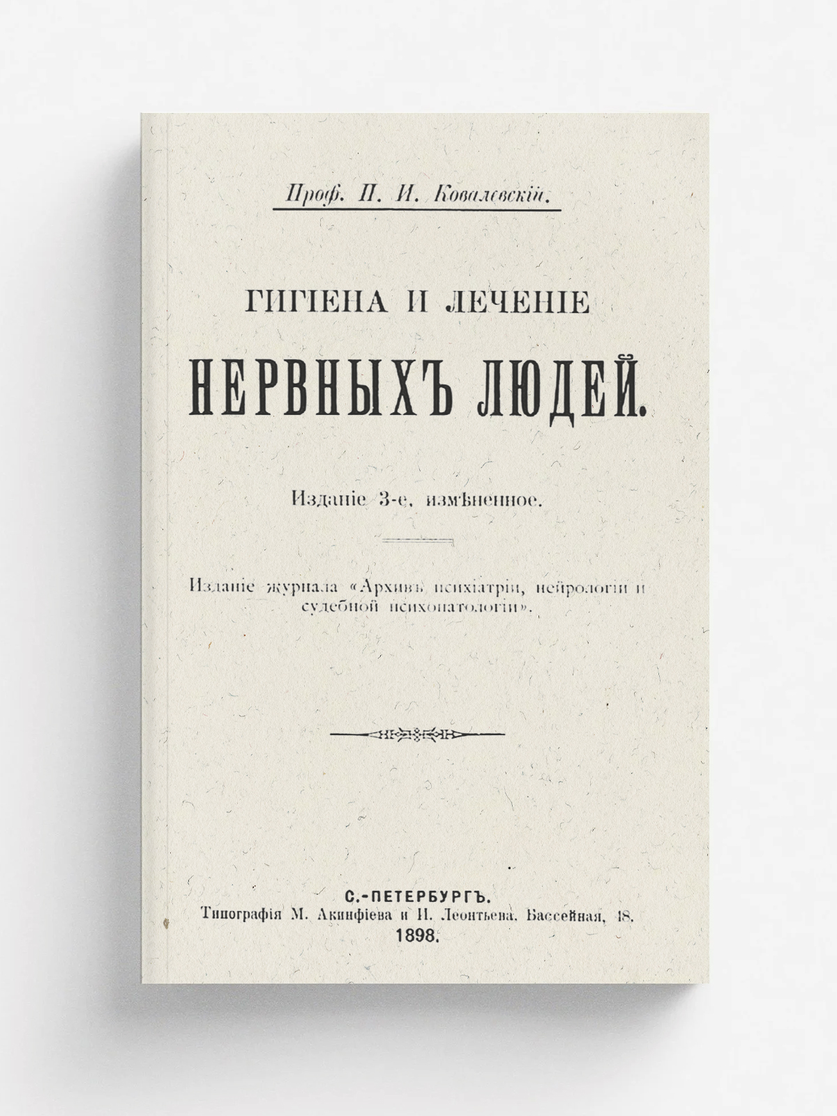 Ковалевский, Павел Иванович (1849–1931). Гигиена и лечение нервных людей [Текст] / проф. П. И. Ковалевский. — Изд. 3-е, измененное. — Санкт-Петербург : издание журнала «Архив психиатрии, нейрологии и судебной психопатологии», 1898 (тип. М. Акинфиева и И. Леонтьева). — 187, [1] с.; 19 см.