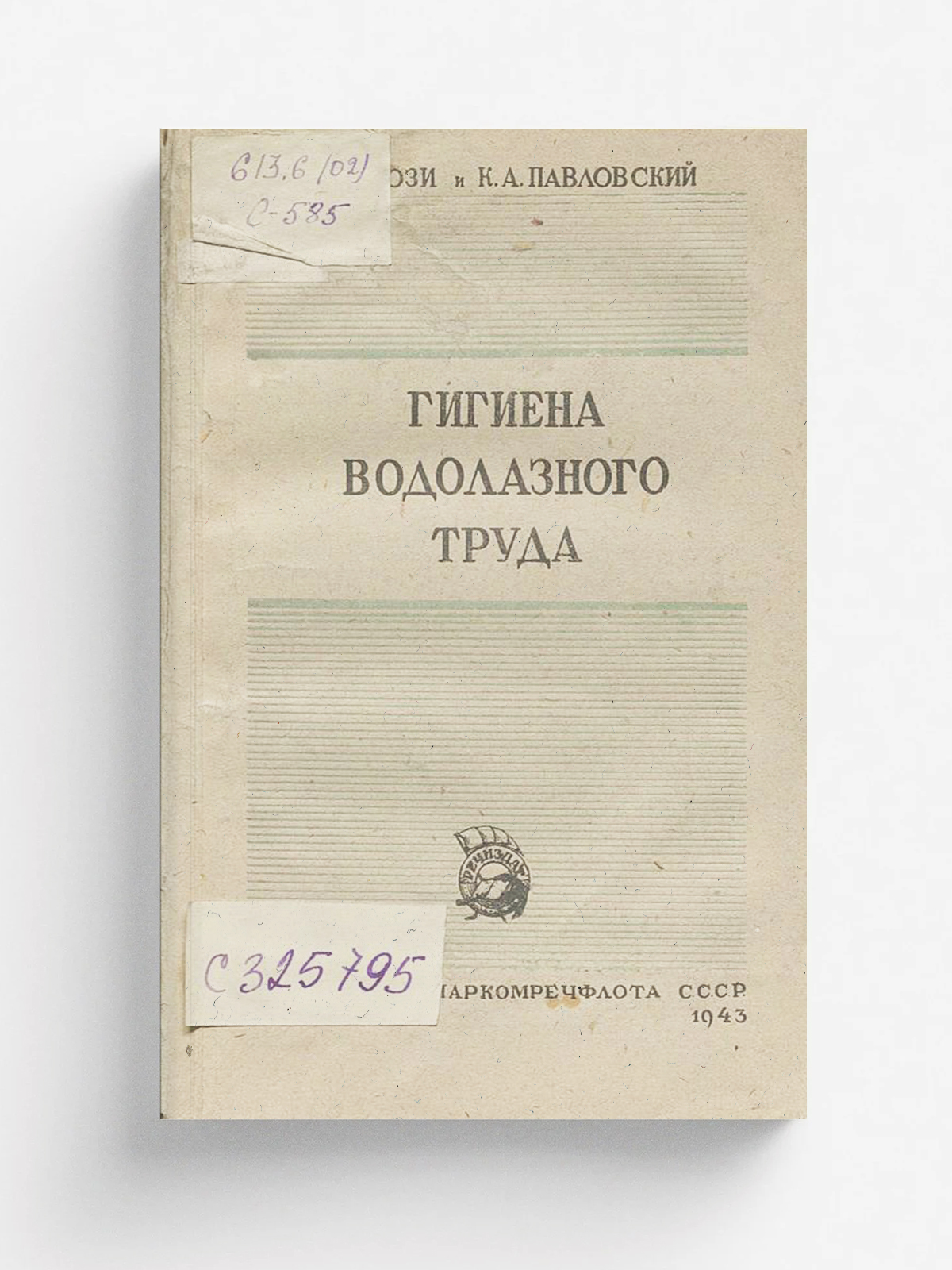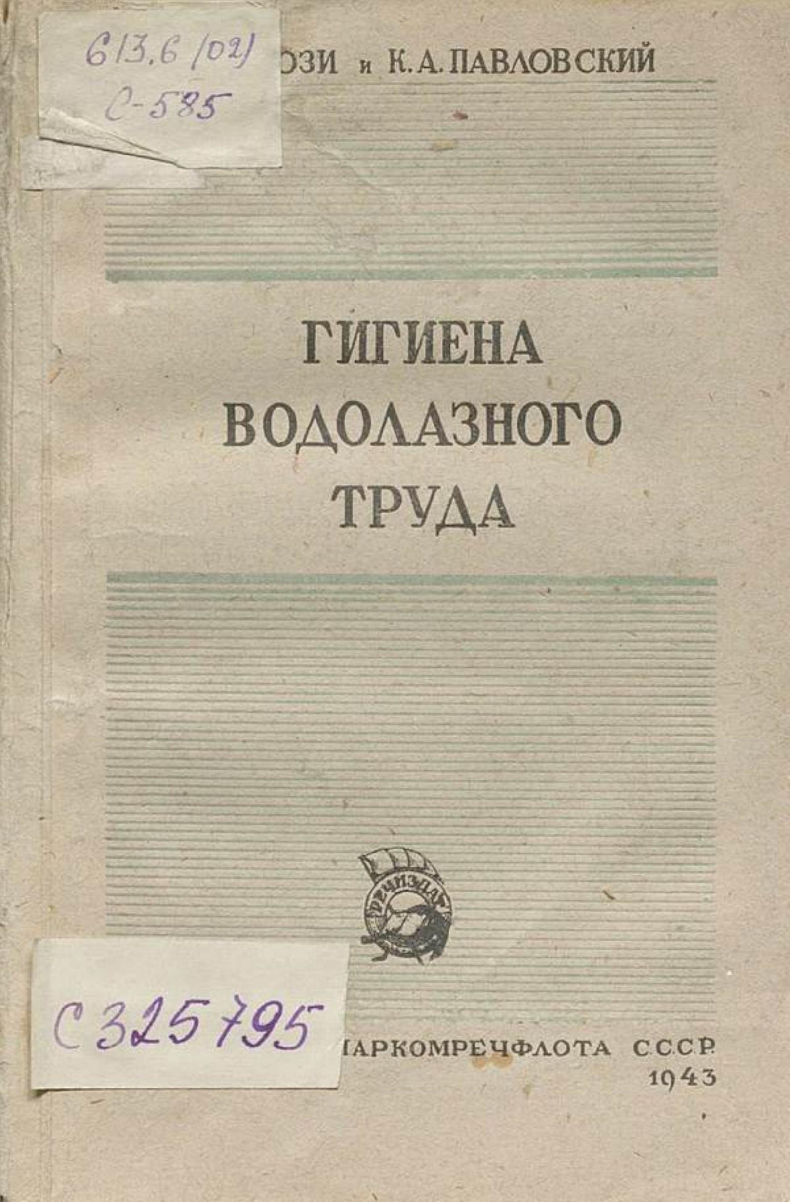 Сози Я. И. Гигиена водолазного труда : утверждено Главным управлением краснознаменного ЭПРОНа в качестве учебника для водолазных техникумов и школ / Я. И. Сози и К. А. Павловский. — Москва : Издательство Наркомречфлота СССР, 1943. — 224 с. : ил., табл.