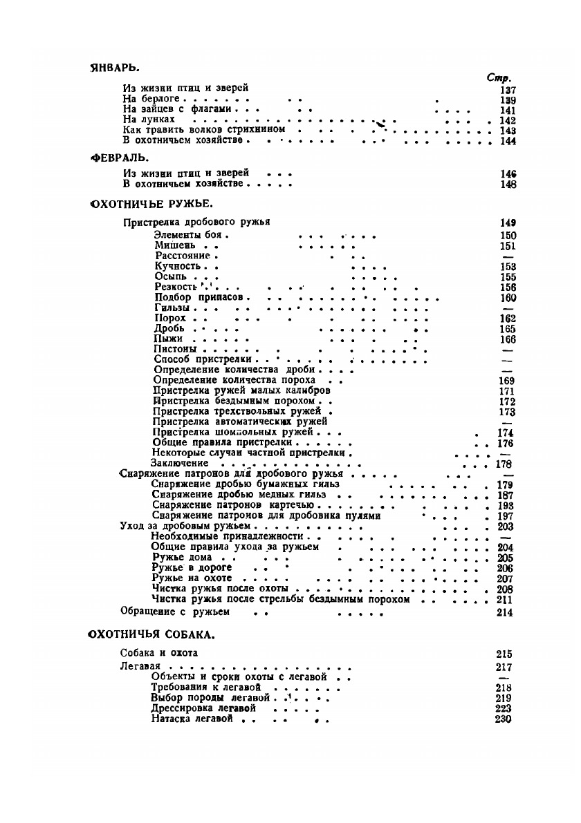 Содержанием книги являются описание техники производства различного рода охот на наших зверей и пернатую дичь, а также практические указания и советы по вопросам пристрелки ружья и ухода за ним, всевозможных способов снаряжения патронов, дрессировки и натаски подружейных собак, выбора одежды и обуви для охотника, организации полевой в бивуачной жизни и т.д. и т.п.