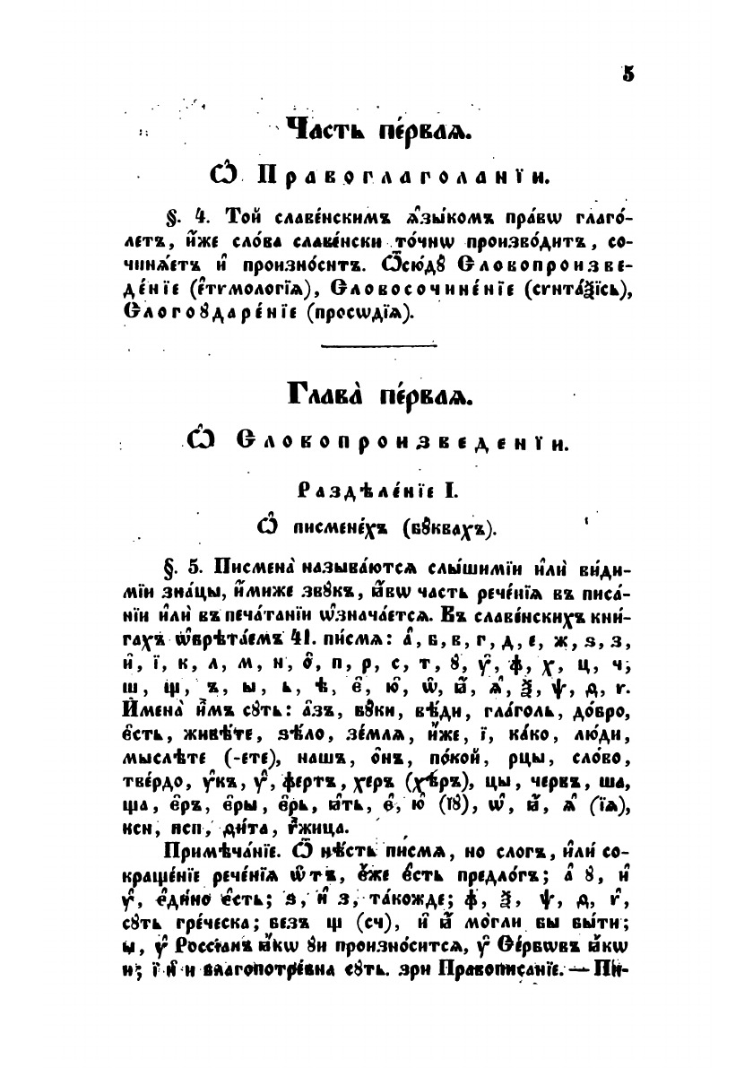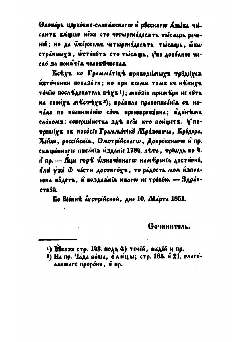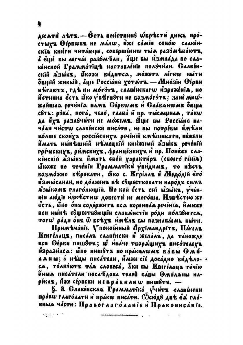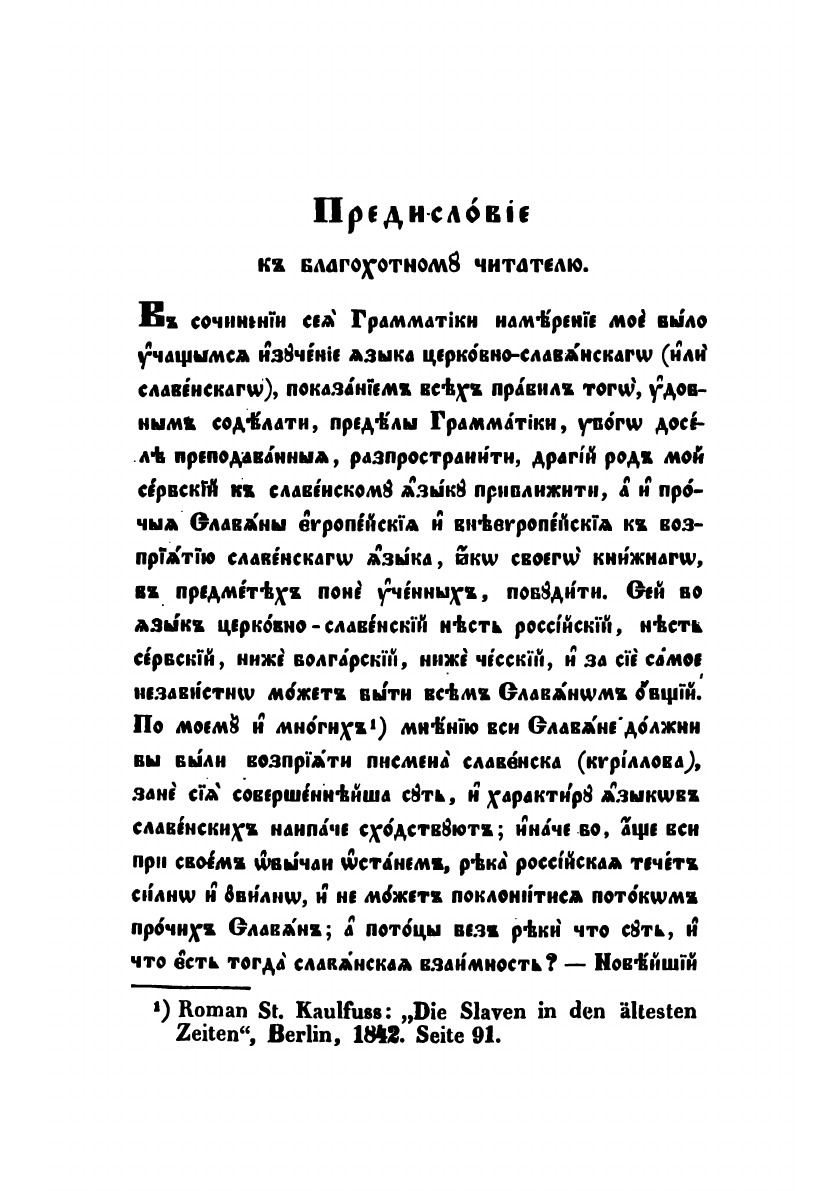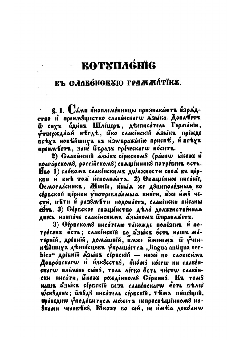 В сочинении сей Грамматики намерение мое было учащимся изучение языка церковно-славянского (или славенского), показанием всех правил того, удобным соделати, пределы Грамматики, убого доселе преподавання, разпространити, драгий род мой сербский к славенскому языку приближити, а и прочия Славяны евпропейския и внеевропеския к возпритию славенского языка, яко своего книжного, в предметех поне ученных, побудити.