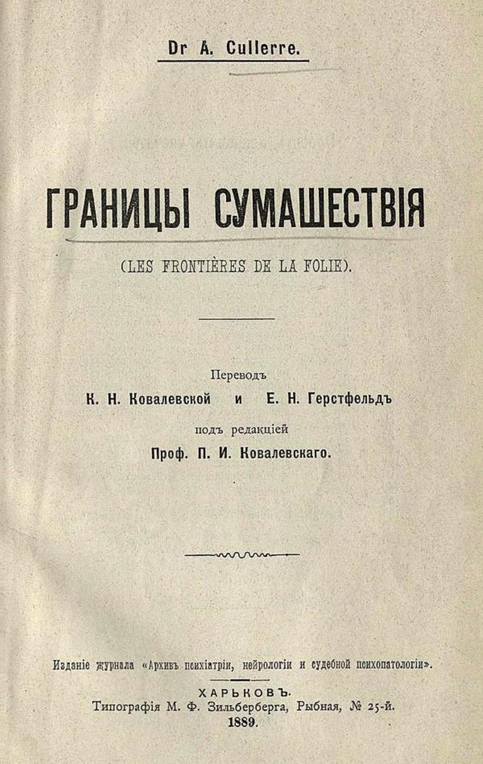 Кюллер, Александр. Границы сумашествия = (Les frontieres de la folie) / Dr. Cullerre; Пер. К. Н. Ковалевской и Е. Н. Герстфельд, под ред. проф. П. И. Ковалевского. — Харьков : журн. «Арх. психиатрии, нейрологии и судеб. психопатологии», 1889. — [4], II, 194 с.; 21.