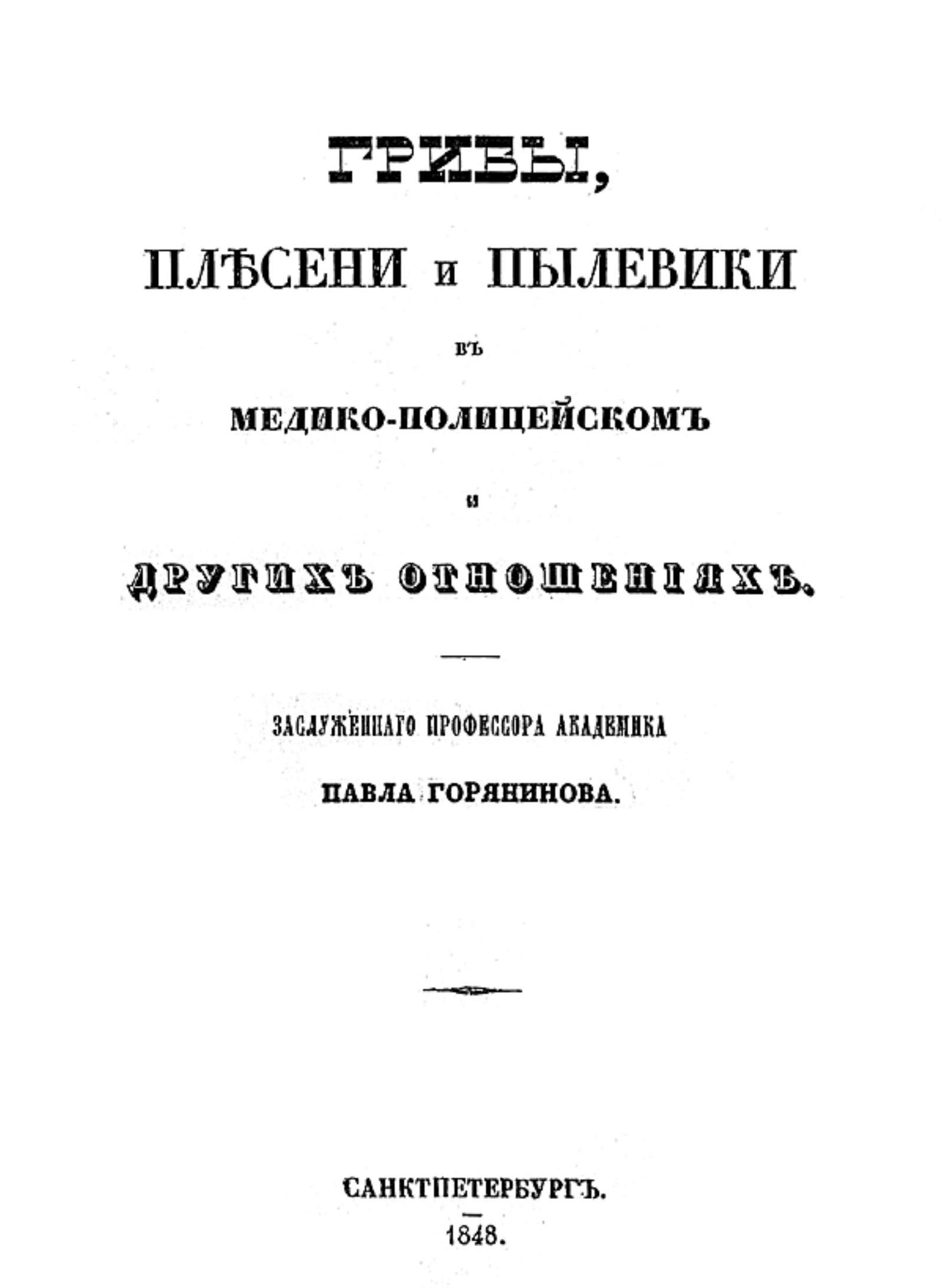 Горянинов, Павел Федорович (1796–1865). Грибы, плесени и пылевики в медико-полицейском и других отношениях / [Соч.] засл. проф. акад. Павла Горянинова. — Санкт-Петербург, 1848. — [2], 126 с.; 23.
