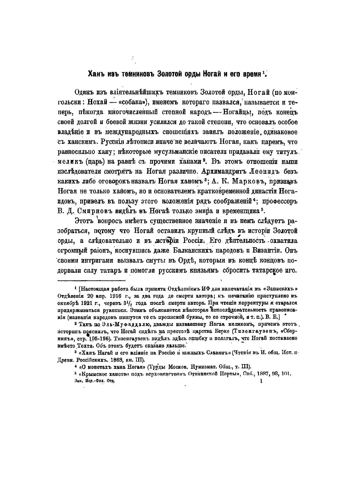 Настоящая работа была принята Отделением исторических наук и филологии Российской Академии Наук для издания в «Записках» Отделения 20 апреля 1916 г., за два года до смерти автора. К изданию приступили в октябре 1921 г. Исследование Н. И. Веселовского посвящено Ногаю, одному из влиятельнейших темников Золотой орды. Во главе войск хана Берке он неоднократно совершал походы против Хулагу и его преемников. После смерти Берке под контролем Ногая оказалась громадная территория от Дона до Дуная. Ногай оставил крупный след в истории Золотой орды, а следовательно и в истории России. Именем Ногая позднее стал называться народ ногайцев. Он своими интригами вызвал смуты в Орде, которые в конце концов подорвали силу татар и помогли русским князьям сбросить татарское иго.