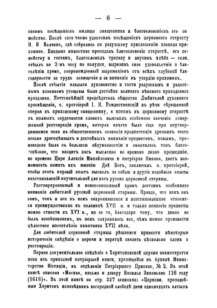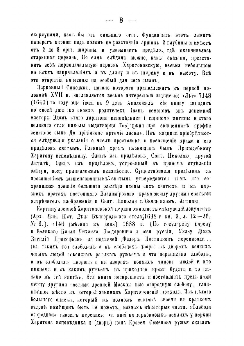 Единственная в Москве церковь во имя св. Харитония Исповедника стояла до революции в дворцовой Огородной слободе близ Чистых прудов. Ее главный престол был освящен во имя Владимирской иконы Божией Матери, а в середине XVII века в ней устроили придел во имя св. Харитония, потому что в день памяти этого святого, 28 сентября (11 октября) 1645 года царь Алексей Михайлович венчался на русский престол. И, по обычаю, он поставил в Москве церковь во имя праздника, который пришелся на день венчания на царство. Экскурс в историю реставрации и освящения церкви.