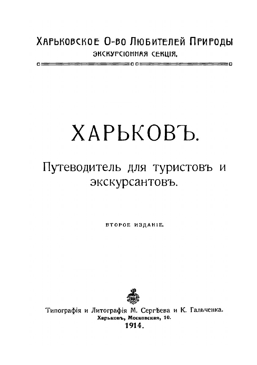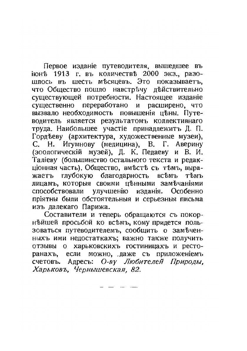 Составители и теперь обращаются с покорнейшей просьбой ко всем, кому придется пользоваться путеводителем, сообщить о замеченных ими недостатках; важно также получить отзывы о харьковских гостиницах и ресторанах, если можно, даже с приложением счетов. Адрес: О-ву Любителей Природы, Харьков, Чернышевская, 82.