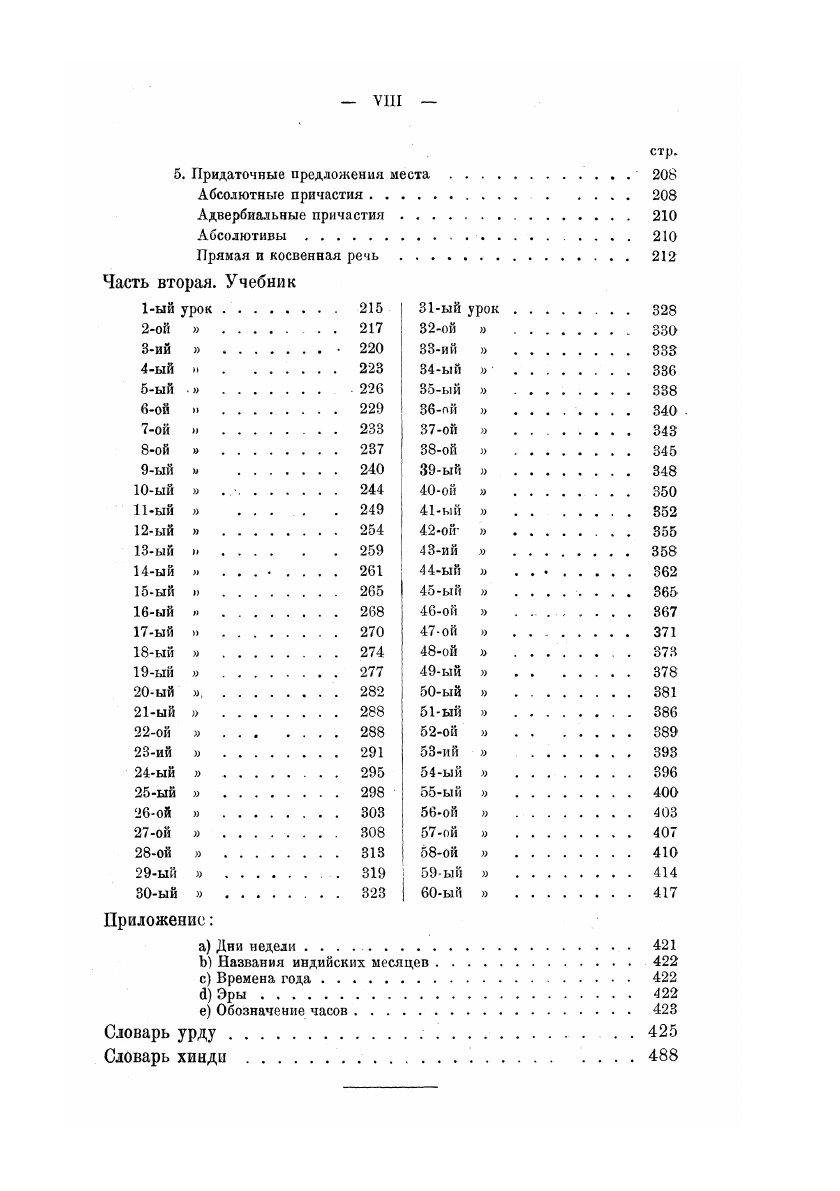 Обе части настоящей книги — грамматика и учебник — органически связаны между собою и дополняют одна другую. Помещение грамматики в начале книги сделано в целях концентрации обобщающего грамматического материала. Учебник, составляющий вторую часть книги, представляет первую на русском языке попытку дать учащемуся пособие, способное подвести его не только к надлежащему пониманию текста, но и к активному овладению языком. С этой именно, целью, как в диалогах, составляющих 15 первых уроков, так и в последующих статьях первого отдела учебника, дается разнообразный материал, состоящий из фраз-штампов и заключающий важнейшие элементы бытового и общественно-политического словаря, усвоение которых вооружает учащегося для активного овладения речью и понимания простых текстов.
