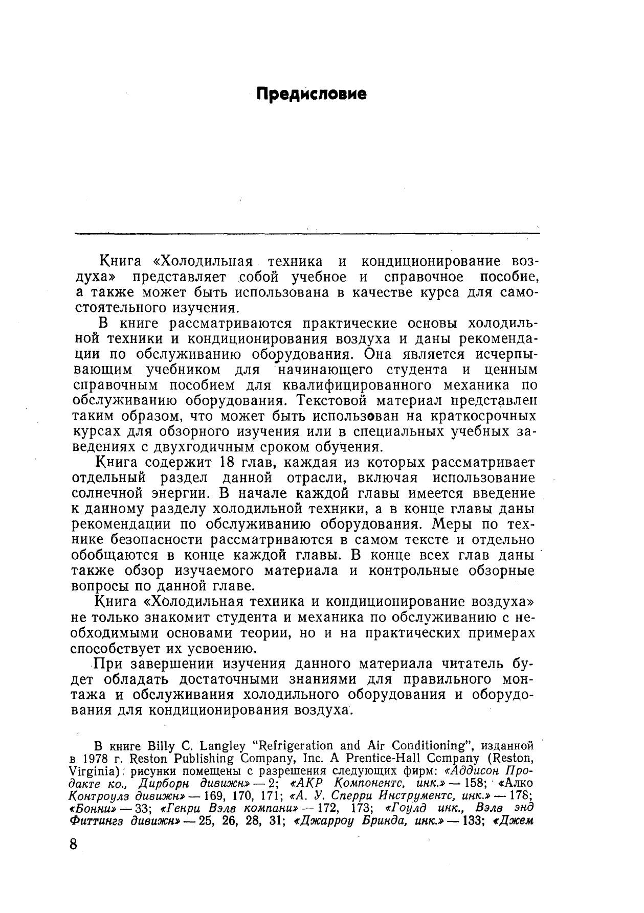 Рассмотрены теоретические основы холодильной техники, компрессоры, основные теплообменные и вспомогательные аппараты, трубопроводы и арматура, электрооборудование, холодильные агенты, используемые в холодильных машинах и установках кондиционирования воздуха. Описаны бытовые холодильники и кондиционеры, торговое холодильное оборудование, приборы регулирования. Особое внимание уделено вопросам монтажа и обслуживания оборудования, правилам безопасности.Книга предназначена для механиков и инженерно-технических работников, занимающихся монтажом и техническим обслуживанием холодильного оборудования и установок кондиционирования воздуха.