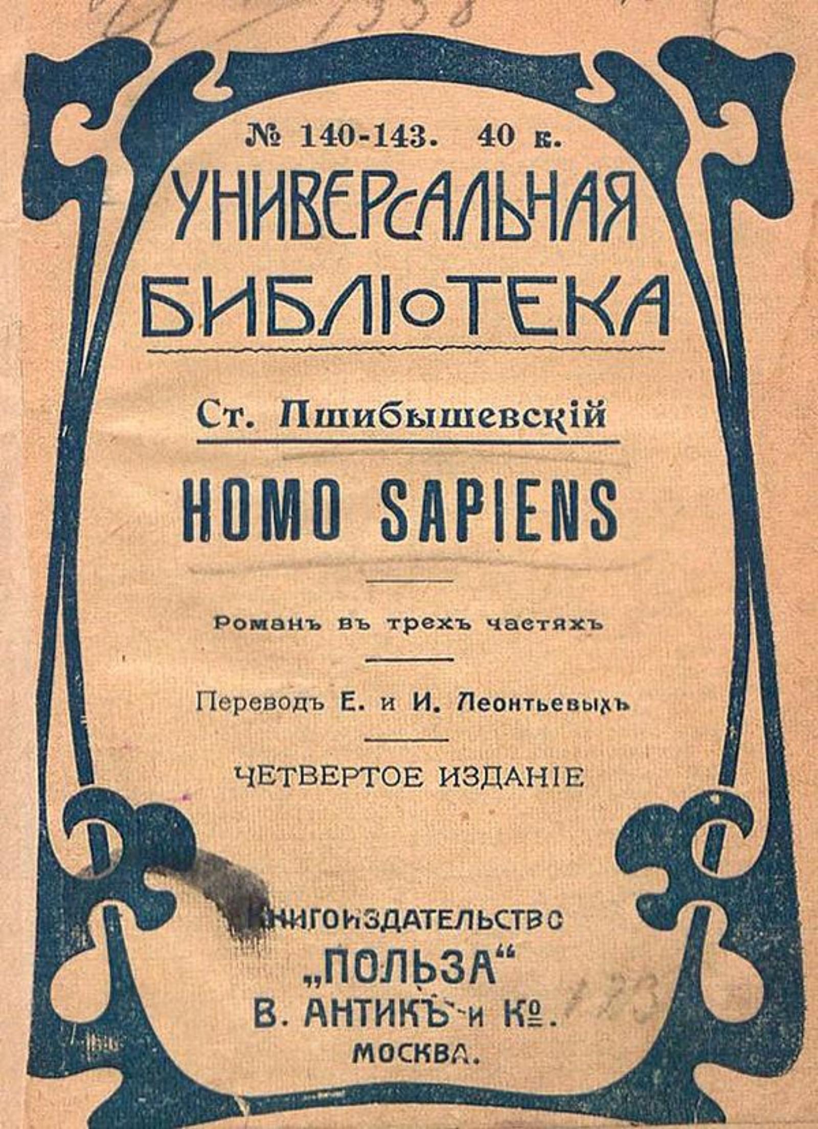 Пшибышевский, Станислав (1868–1927). Homo sapiens : Роман в 3 ч. / Станислав Пшибышевский; Пер. Е. и И. Леонтьевых. — 2-е изд. — Москва : «Польза» В. Антик и К°, [1910]. — 408 с.; 14. — (Универсальная библиотека; № 140–143).