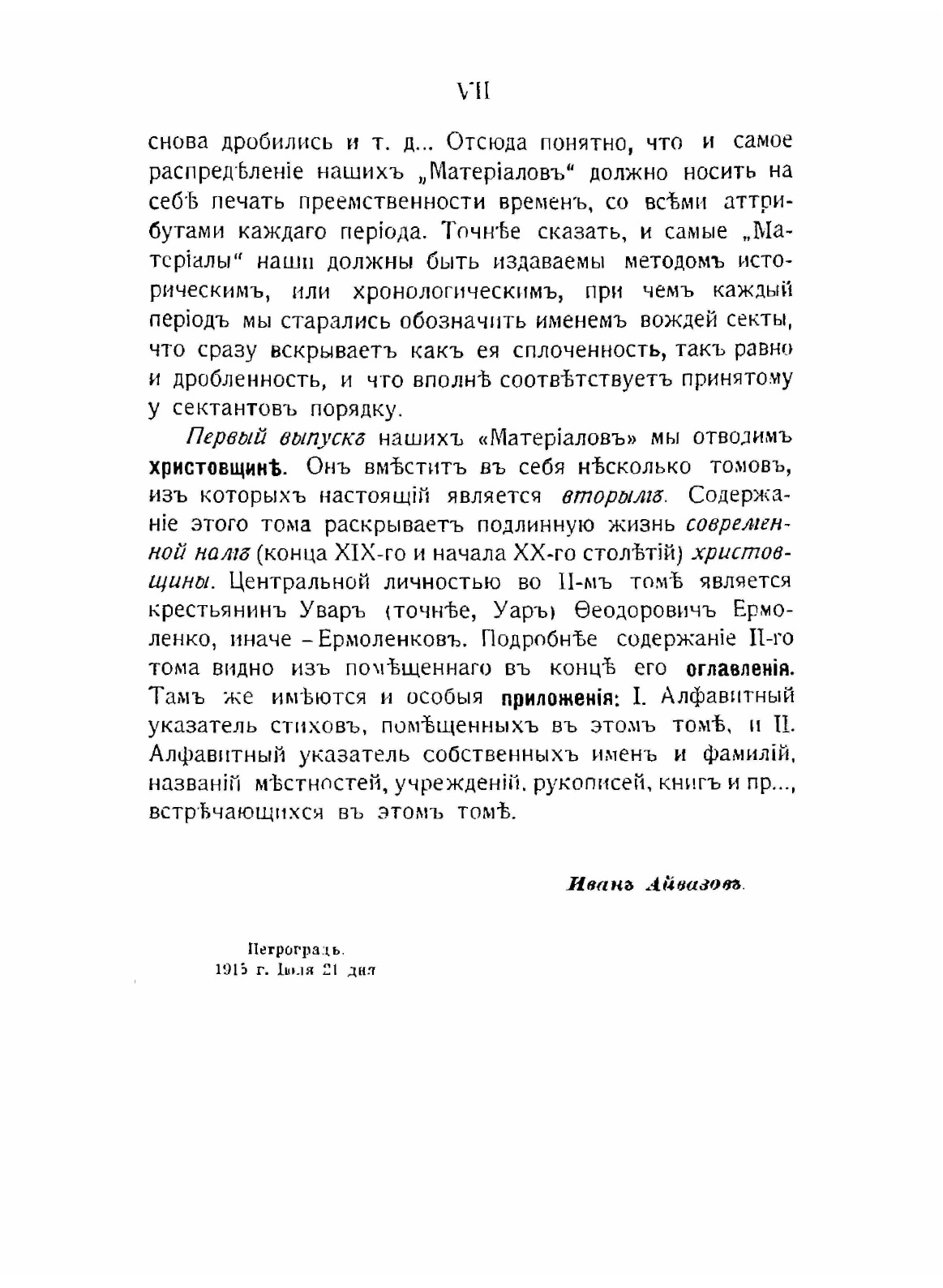 В предисловии к изданию Айвазов говорит что, исследование русских мистических сект является достаточно трудным делом, т. к. сектанты стараются тщательно скрывать свое религиозное мировоззрение и быт под видом строго православия или раскольнических толков. По мнению автора, опубликование материалов для исследования русских мистических сект "Является делом первейшей важности: как для научного изучения этих сект, так и для определения отношения к ним церкви и государства". В "Материалах приводятся подлинные свидетельства самих сектантов. Первый том посвящен христовщине, второй - раскрывает жизнь современной автору христовщины. Центральной личностью второго тома является Увар (Уар) Федорович Ермоленко. В издании имеются алфавитные указатели стихов, собственных имен и фамилий, названий местностей, книг и т. д.