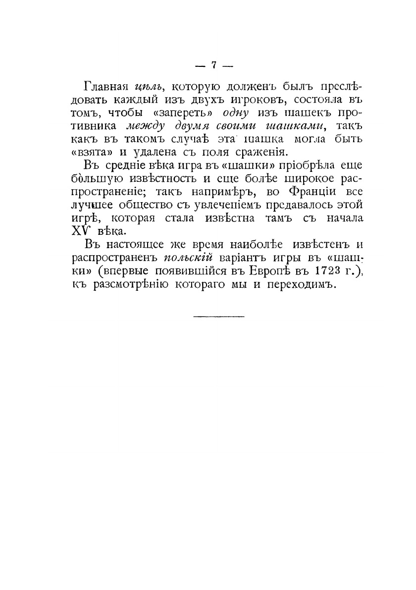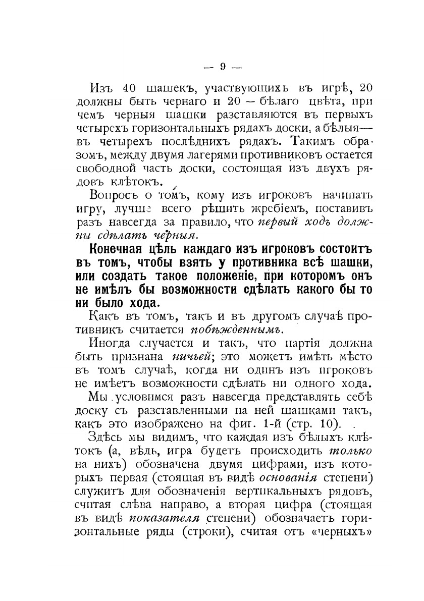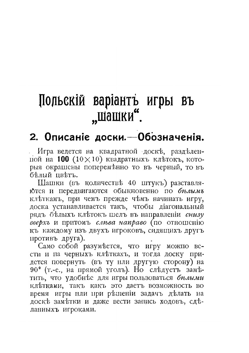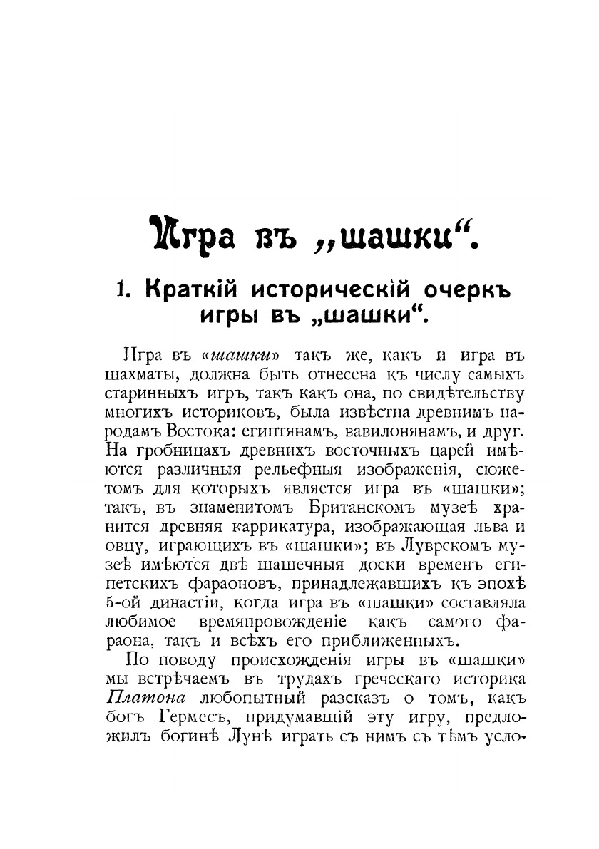 Игра в "шашки". С рисунками. Издание на старорусском языке. Составитель книги даёт краткий исторический экскурс, описание и правила игры в шашки на стоклеточной доске, примеры игры, знакомит с вариацией шашечной игры - поддавками.