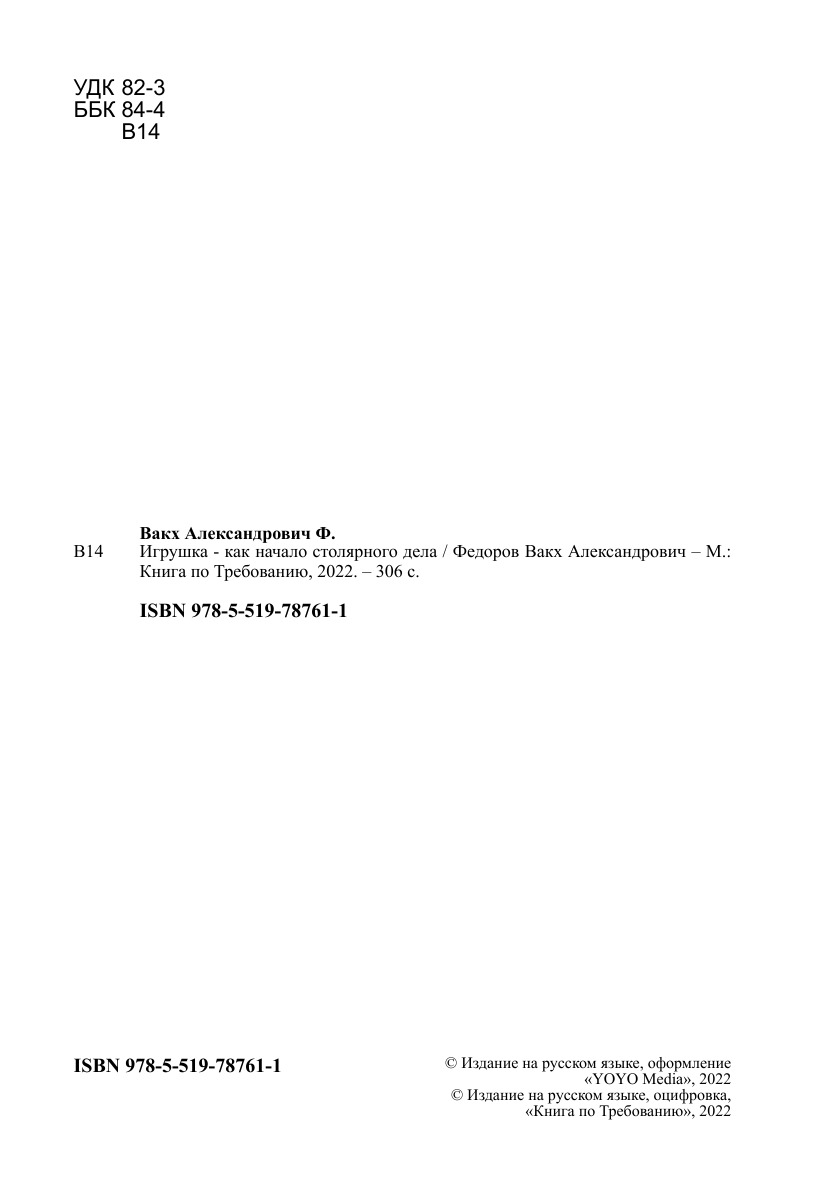 Печатная книга «Игрушка - как начало столярного дела» в мягкой обложке, язык - русский. В книге 306 страниц, она напечатана на белой офсетной бумаге плотностью 80 г/м². Формат издания — 148x210 мм. Все книги аккуратно упаковываем в прочный трёхслойный непрозрачный картонный конверт.