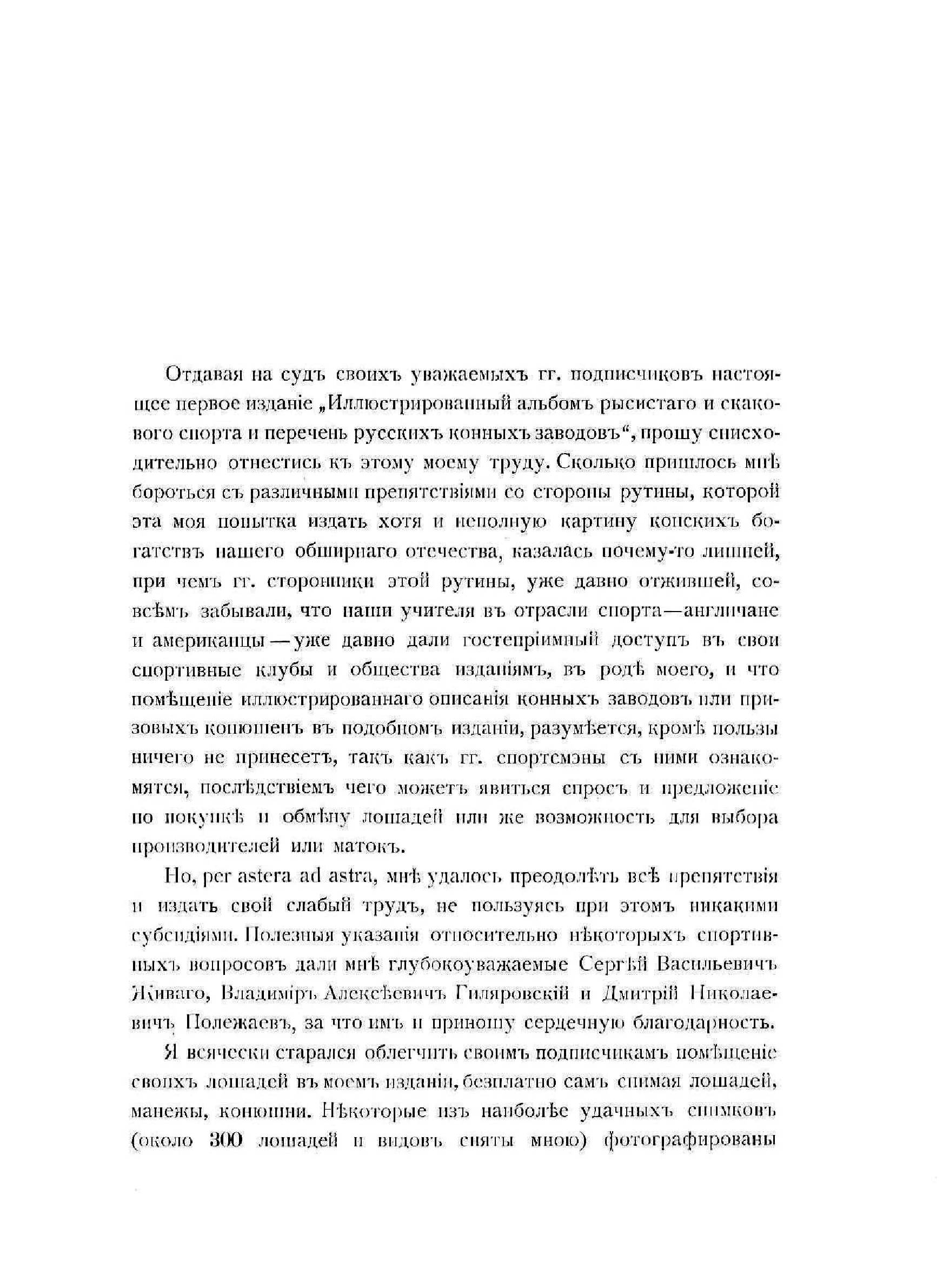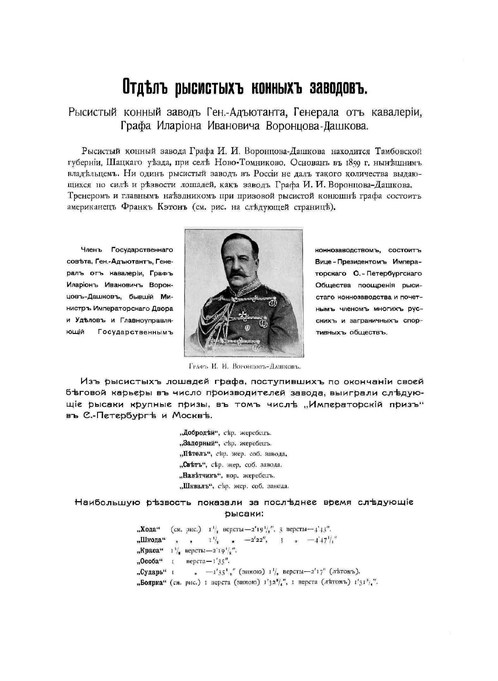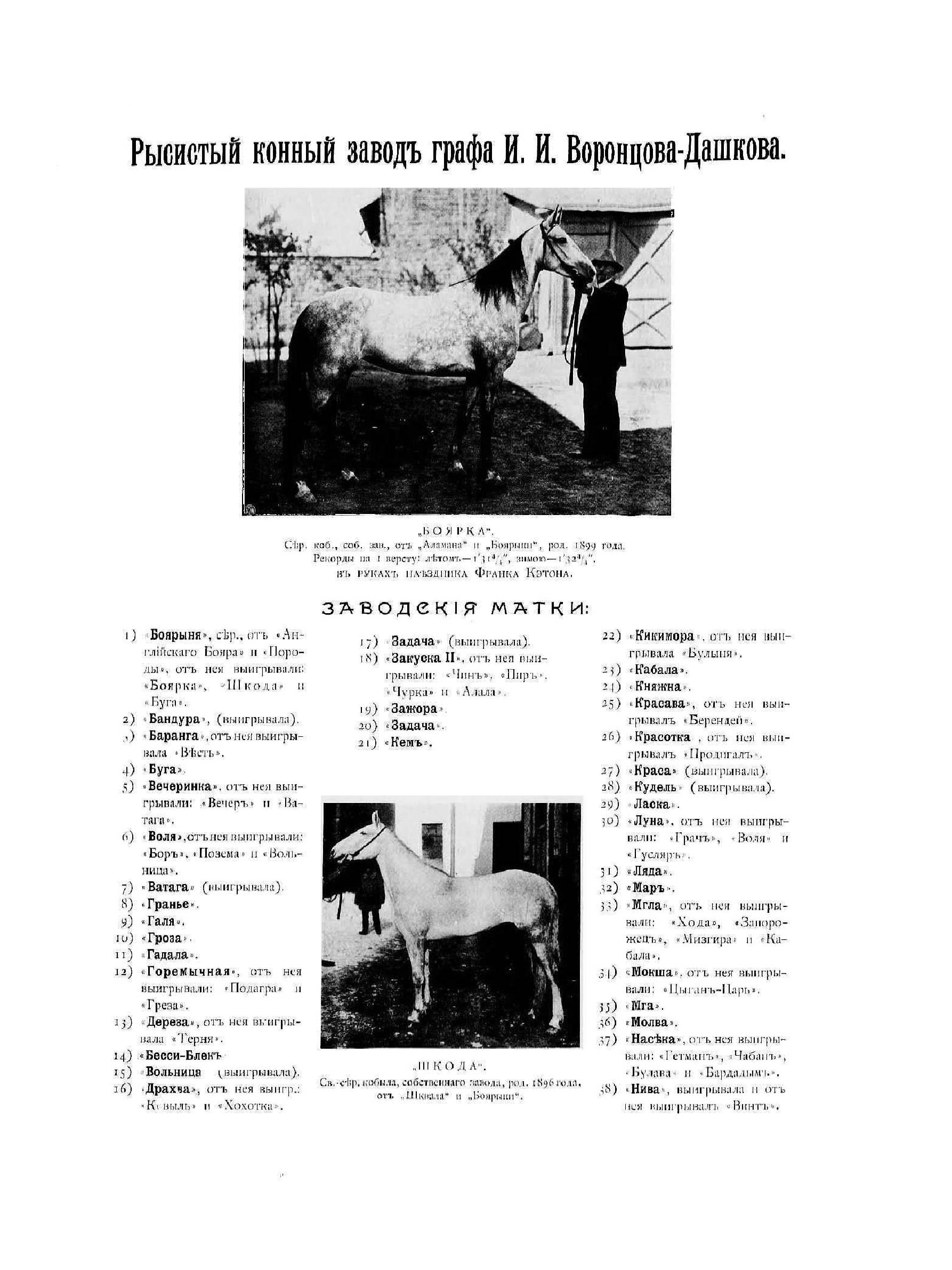 В альбоме представлены сотни фотографий, на которых изображены русские конные заводы, конюшни, их владельцы, лошади и кони, архитекторы заводов, начальники кавалерийских частей и отделов, Парфорсная охота гвардейской кавалерии, Тверское кавалерийское юнкерское училище, наездники (Лейб-гвардии конного полка, 3-го Сумского драгунского полка, Лейб-гвардии Кирасирского Его Величества полка, и др.), члены императорских скаковых обществ, тренеры и жокеи. В альбоме содержатся перечень и краткое описание русских конных заводов, краткие сведения о лошадях и их владельцах.