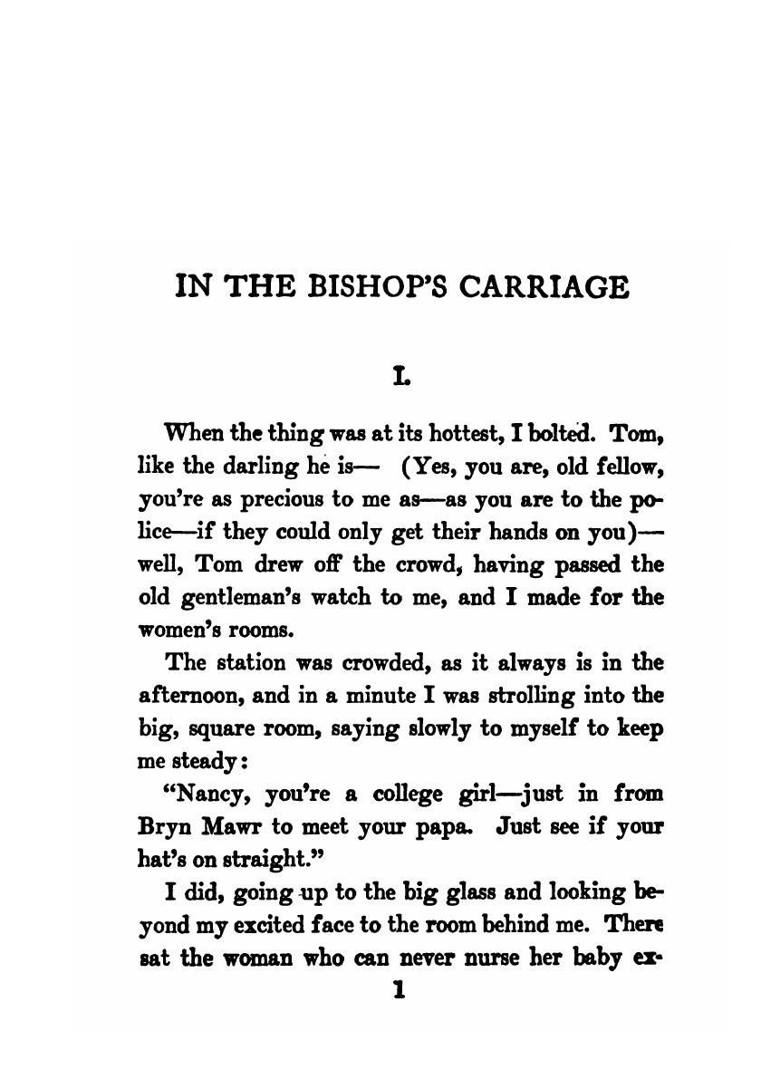 Печатная книга «In the Bishop's Carriage» в мягкой обложке, язык - английский. В книге 297 страниц, она напечатана на белой офсетной бумаге плотностью 80 г/м². Формат издания — 148x210 мм. Все книги аккуратно упаковываем в прочный трёхслойный непрозрачный картонный конверт.