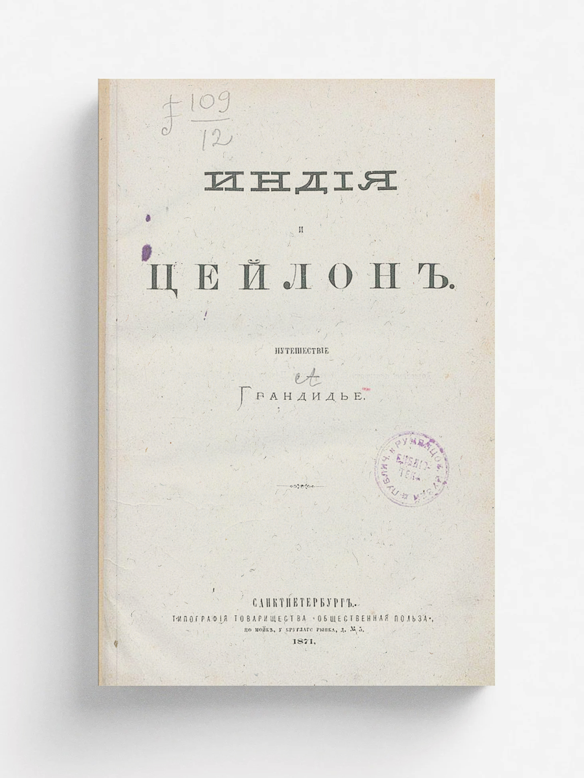 Грандидье, Альфред (1836–1921). Индия и Цейлон : Путешествие Грандидье. — Санкт-Петербург : тип. т-ва «Обществ. польза», 1871. — [2], II, 322 с., 1 л. карт. : ил.; 22.